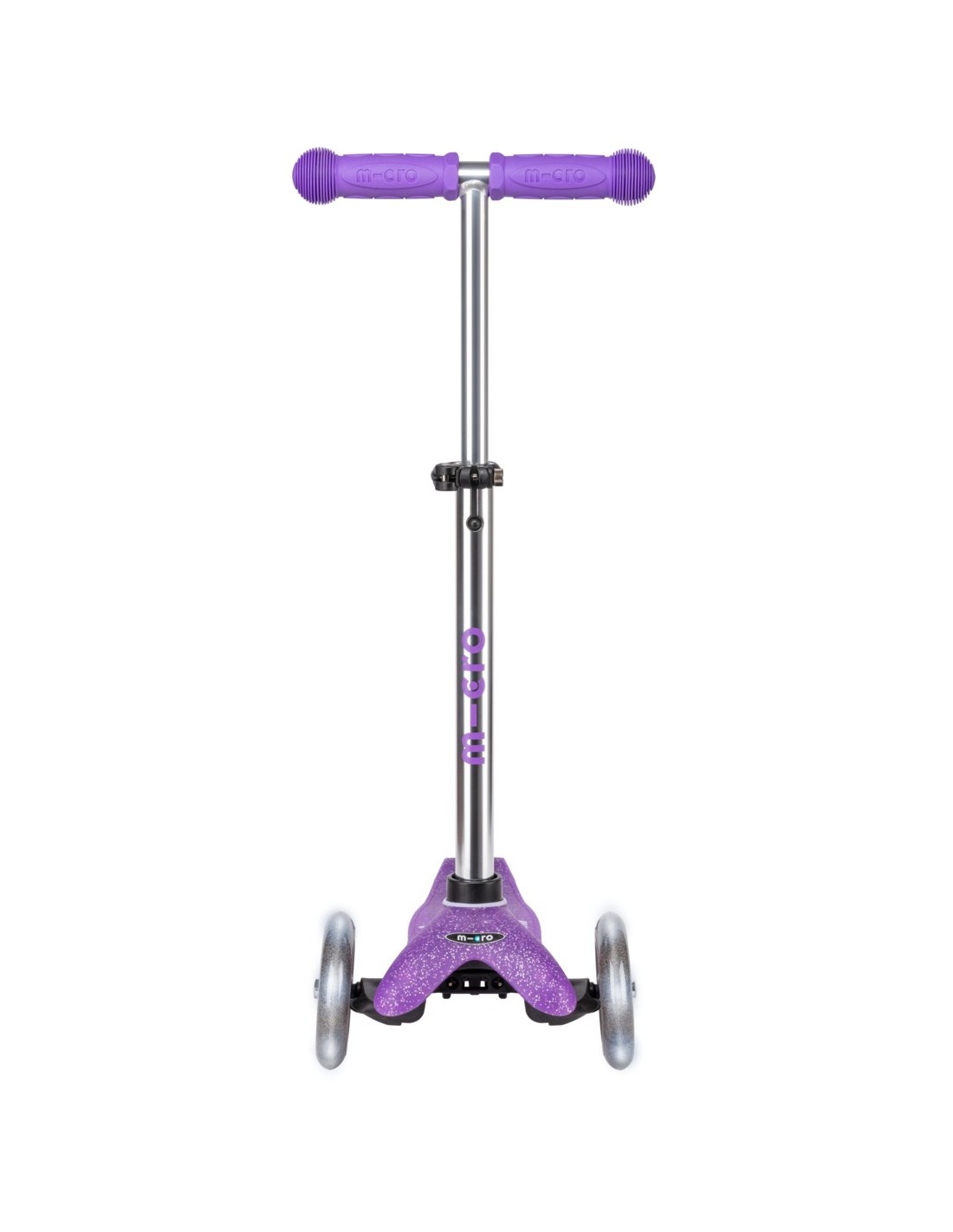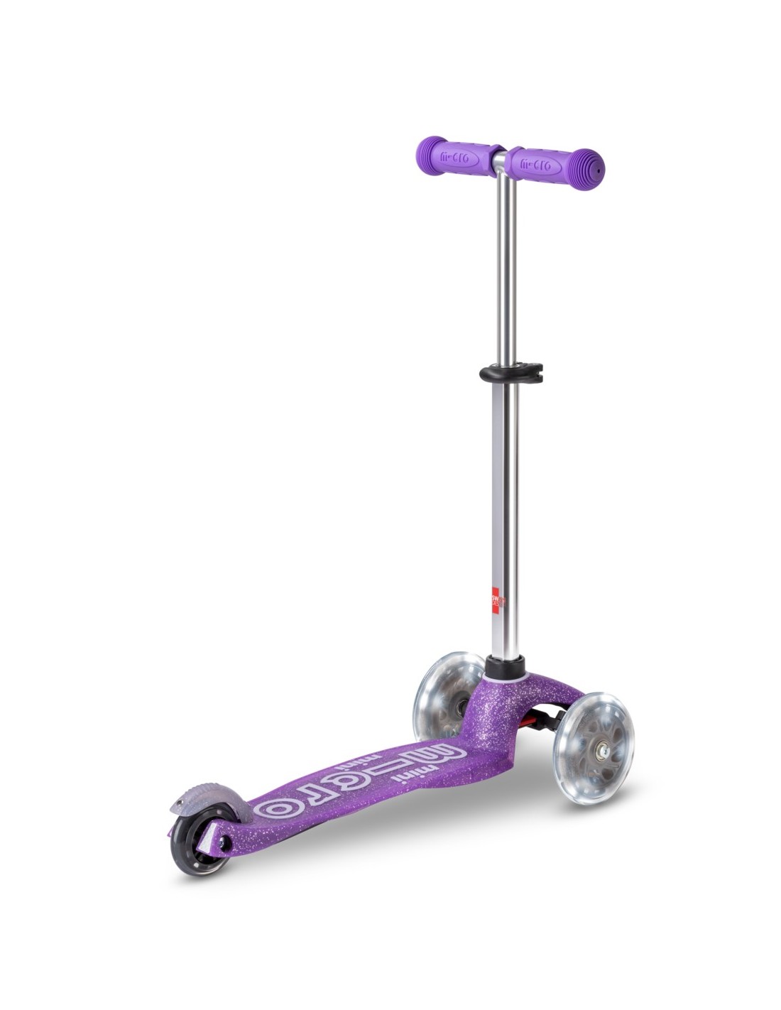 El patinete Mini Micro no sólo estimula el movimiento y el ejercicio, sino que también ayuda a los niños a aprender equilibrio, coordinación y habilidades motrices. Especialmente diseñado para niños pequeños y niños en edad preescolar. Tiene los puños antideslizantes con acabado redondeado, la barra de dirección es de aluminio con acabado metalizado y la base tiene un brillo de purpurina que encantará a los más pequeños. Es de fácil montaje y desmontaje con un solo clic. Las ruedas delanteras tienen luces LED de color blanco. El freno trasero no se calienta ni desgasta la rueda y tiene unas tiras reflectantes en la parte trasera.