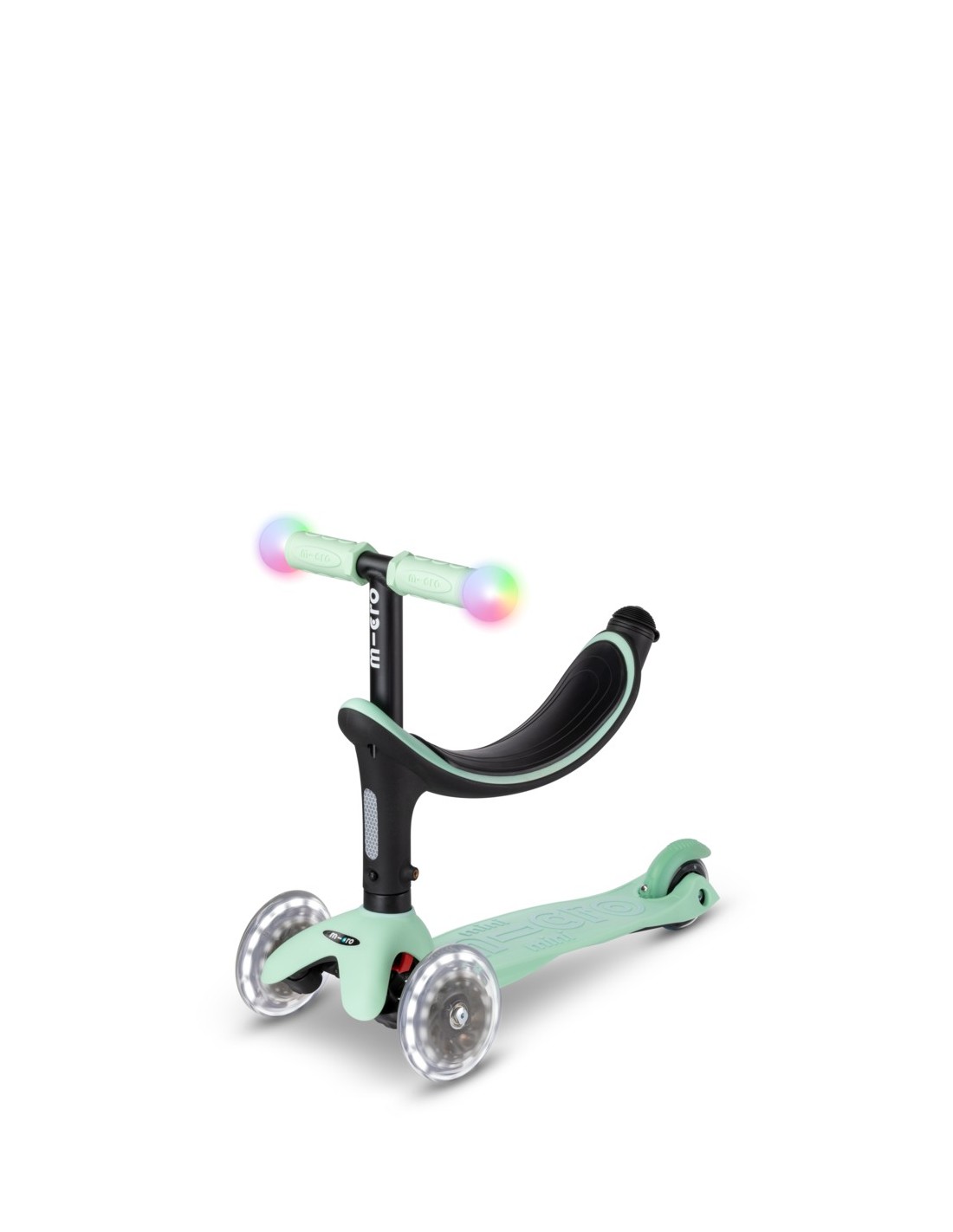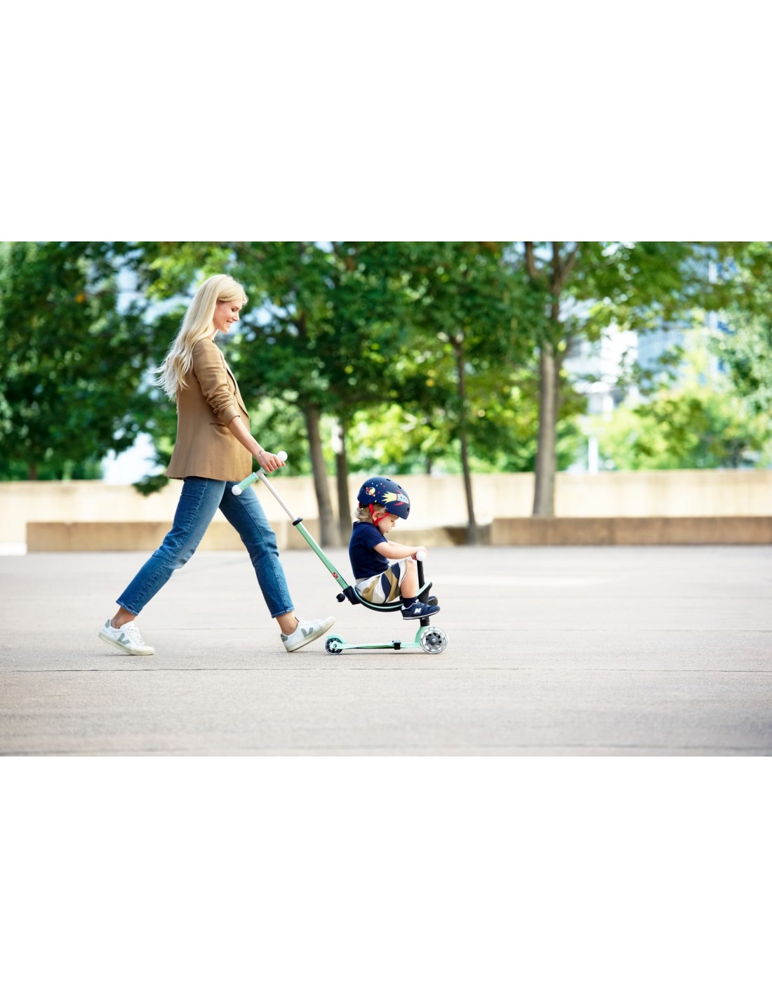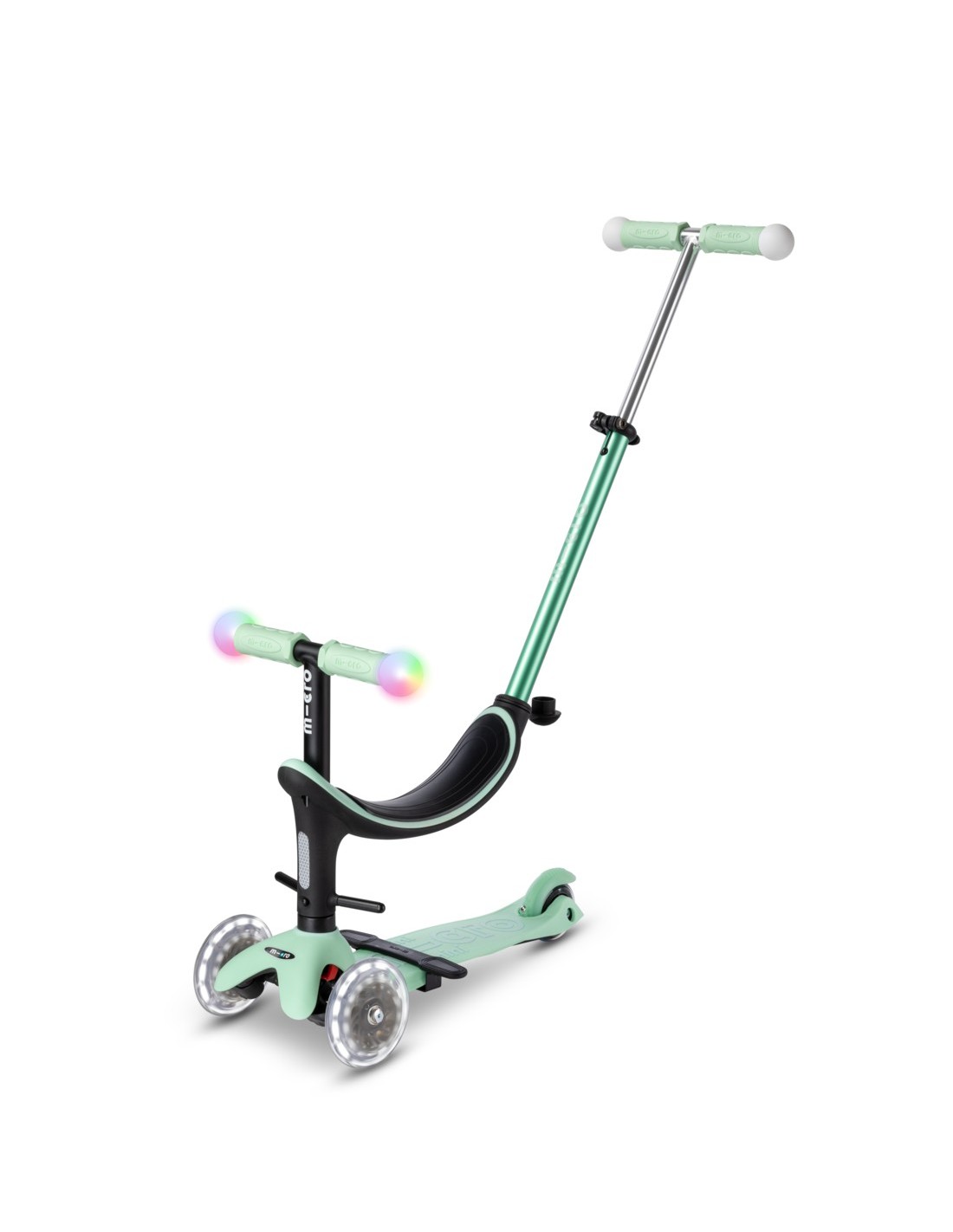 El Micro Mini2Grow Deluxe Magic es el compañero perfecto para tu peque hasta los 6 años, aproximadamente. Se puede utilizar en diferentes posiciones: con asiento y barra de empuje desplegable para los padres, la cual se puede usar verticalmente o en posición horizontal estándar; sin barra de empuje, similar a una bicicleta de equilibrio; y como un patinete clásico.