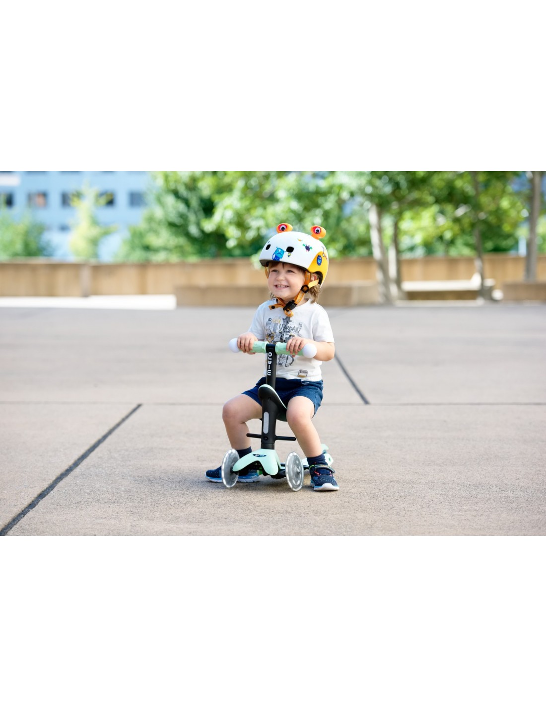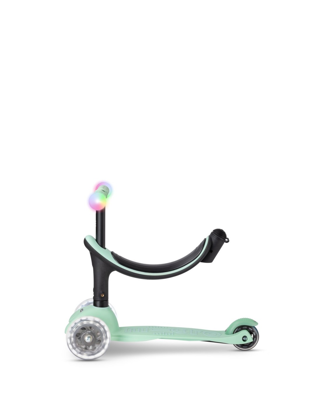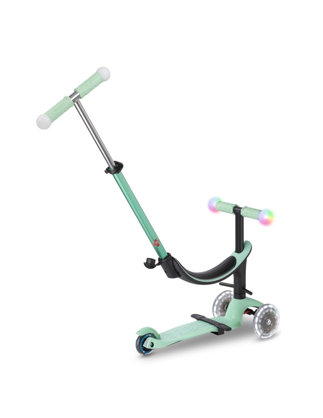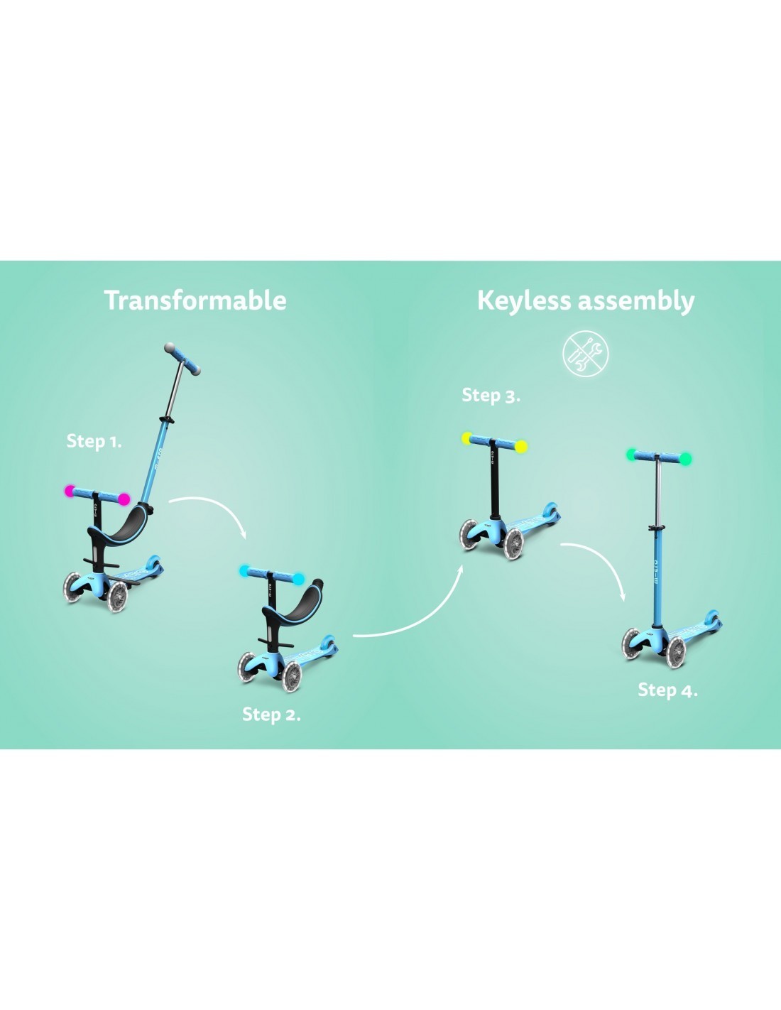 El Micro Mini2Grow Deluxe Magic es el compañero perfecto para tu peque hasta los 6 años, aproximadamente. Se puede utilizar en diferentes posiciones: con asiento y barra de empuje desplegable para los padres, la cual se puede usar verticalmente o en posición horizontal estándar; sin barra de empuje, similar a una bicicleta de equilibrio; y como un patinete clásico.