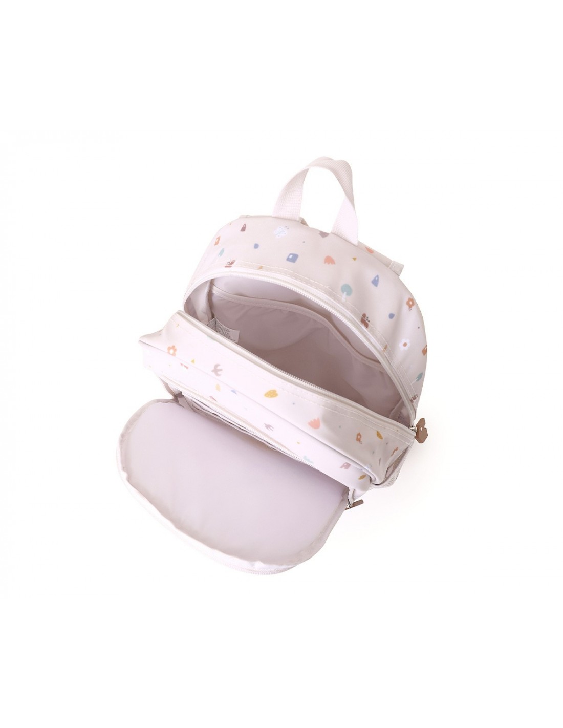 Mochila infantil de tamaño más pequeño para ir al cole o a la escuela infantil. Ideal para niños entre 1 y 5 años. Exterior impermeable. Asas ajustables y acolchadas. Cierre en clip en el pecho. Incluye un bolsillo lateral para llevar una botella.