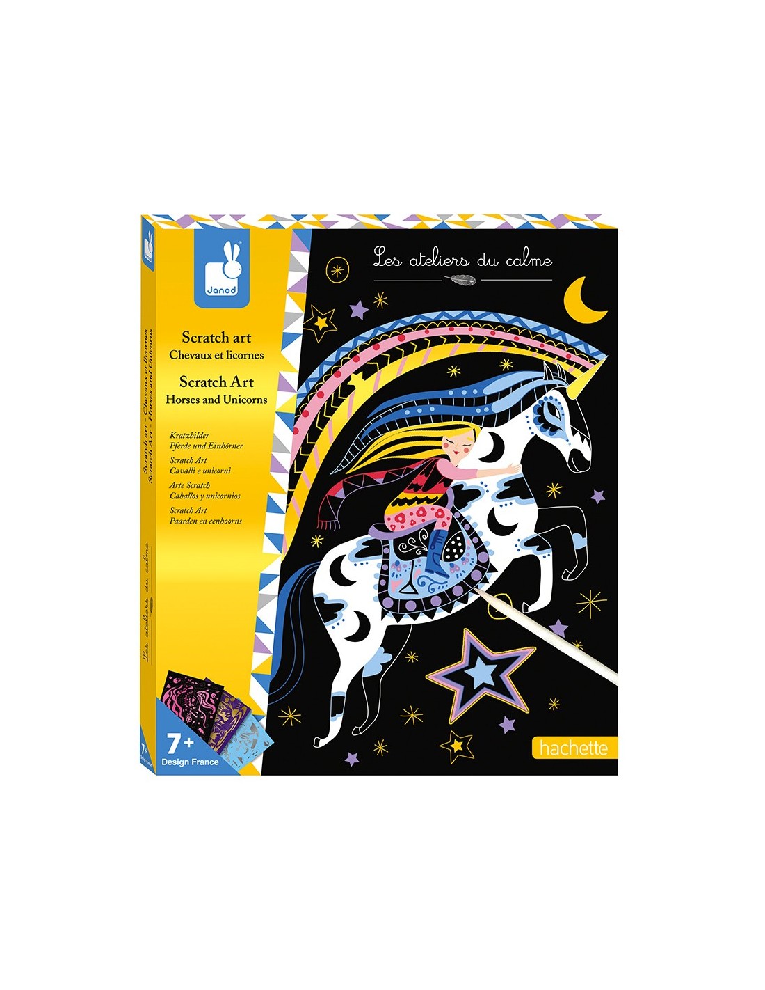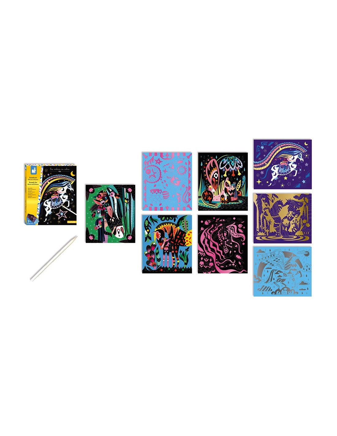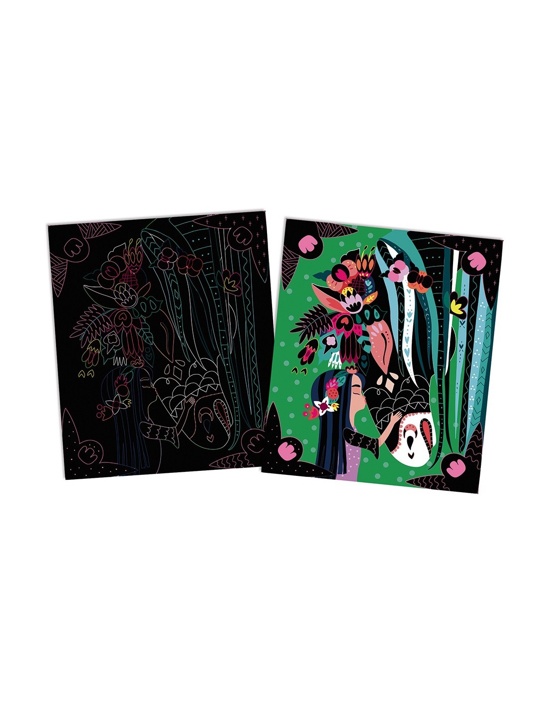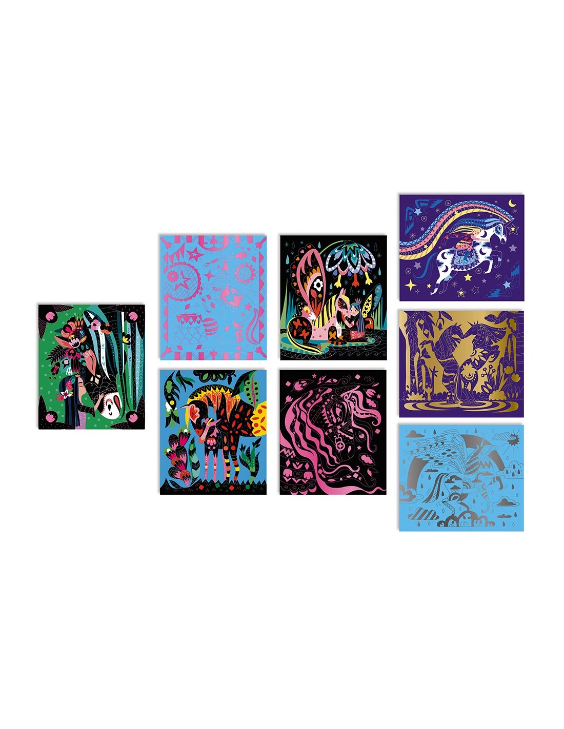 Esta caja contiene ocho tarjetas para rascar, una herramienta de madera y un manual con modelos e instrucciones.