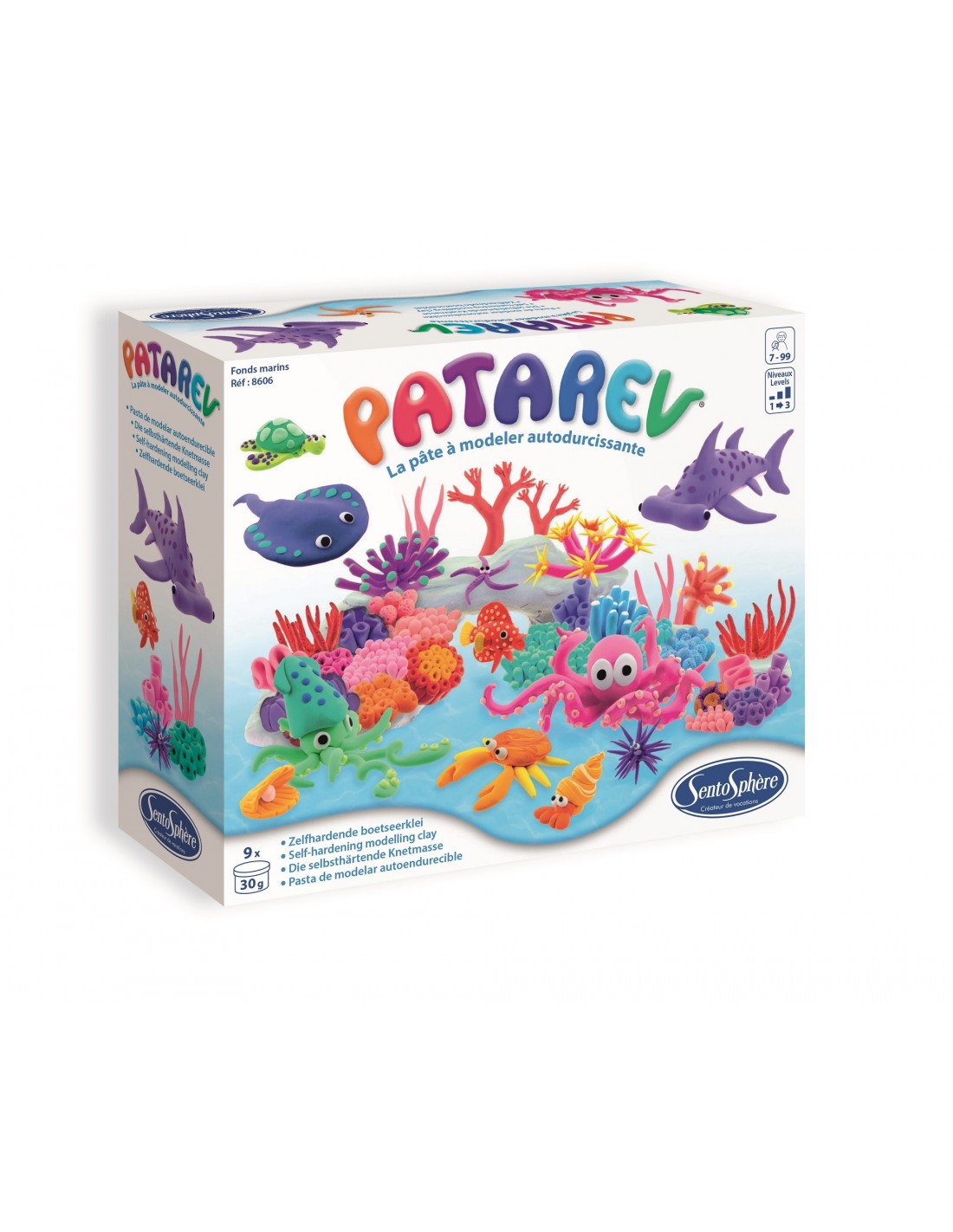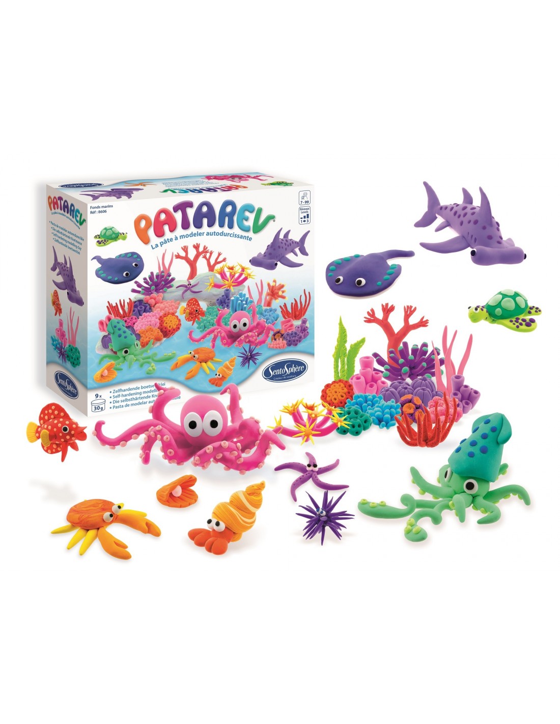 ¡Con esta caja y sus 9 tarros Patarev, tu peque modelará increíbles criaturas marinas y su entorno siguiendo, si quiere, las instrucciones ilustradas paso a paso! Creará los corales, conchas y peces más extraordinarios con esta caja de 9 colores brillantes que, además, se pueden mezclar. Se ofrecen 20 creaciones paso a paso, para que su mundo marino se vuelva tan fascinante como un acuario real.