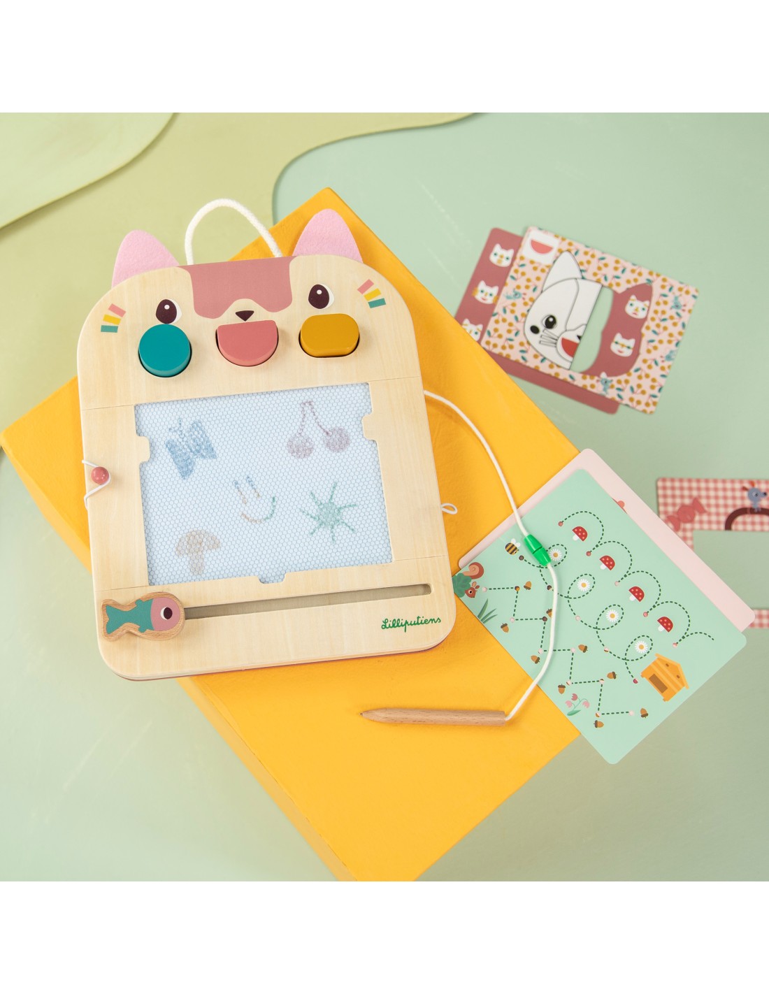 Esta pizarra mágica ofrece diversión infinita para dibujar y jugar. Con diferentes colores, 3 sellos con formas geométricas, 6 tarjetas con 12 juegos y un lápiz de madera, estimula las manos y las mentes de los más pequeños. ¿Cometiste un error o quieres hacer un nuevo dibujo? Sólo hay que deslizar el pececito para borrar todo. Las tarjetas de juego se guardan en la ranura trasera prevista para ello, y el lápiz de madera está sujeto con una cuerda para que no se pierda.