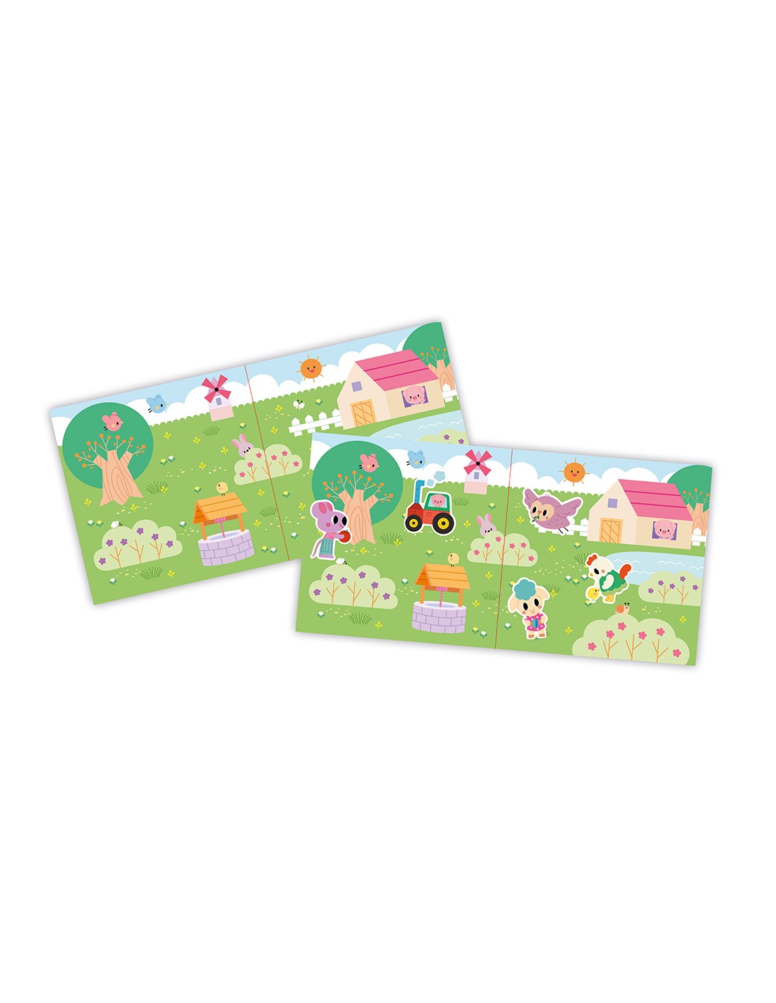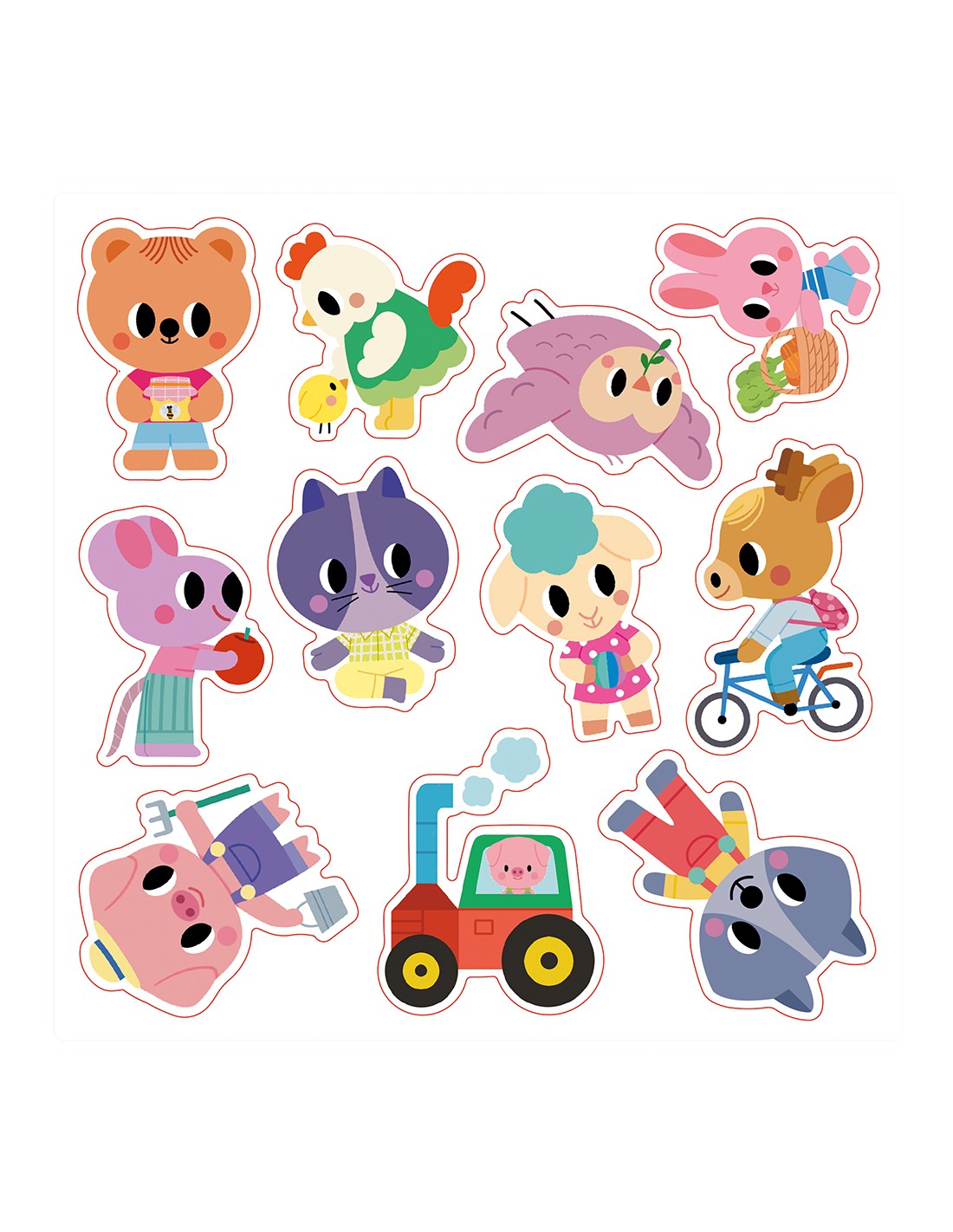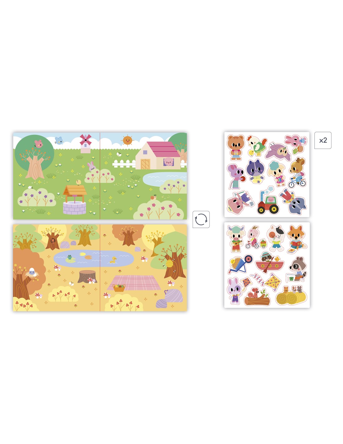 ¡Pega y despega sin parar! Este kit creativo permite pegar pegatinas reposicionables en un escenario de doble cara: una cara del bosque y otra de la granja. Las pegatinas tienen una base transparente para integrarse en el escenario. Esta actividad permite que tu peque desarrolle la destreza y creatividad.