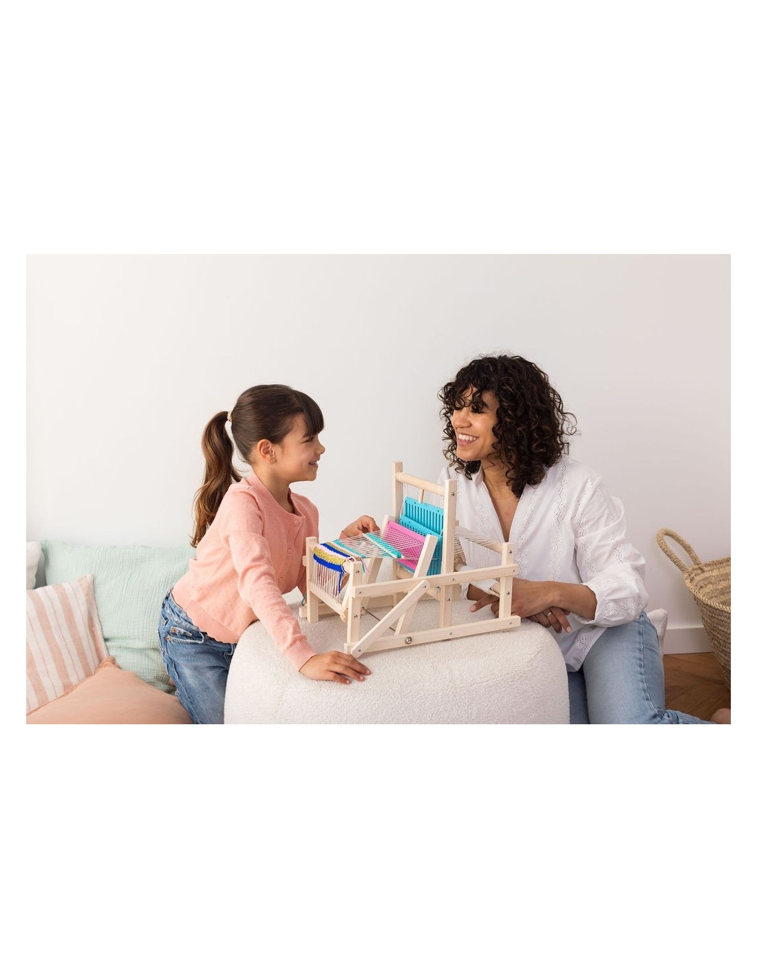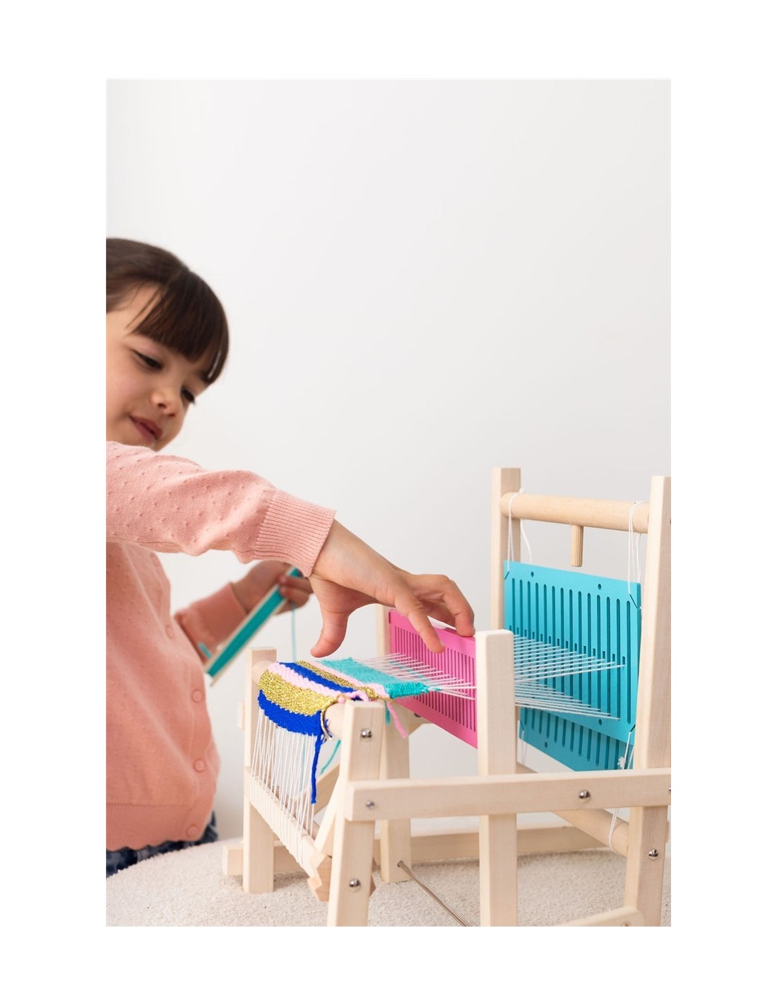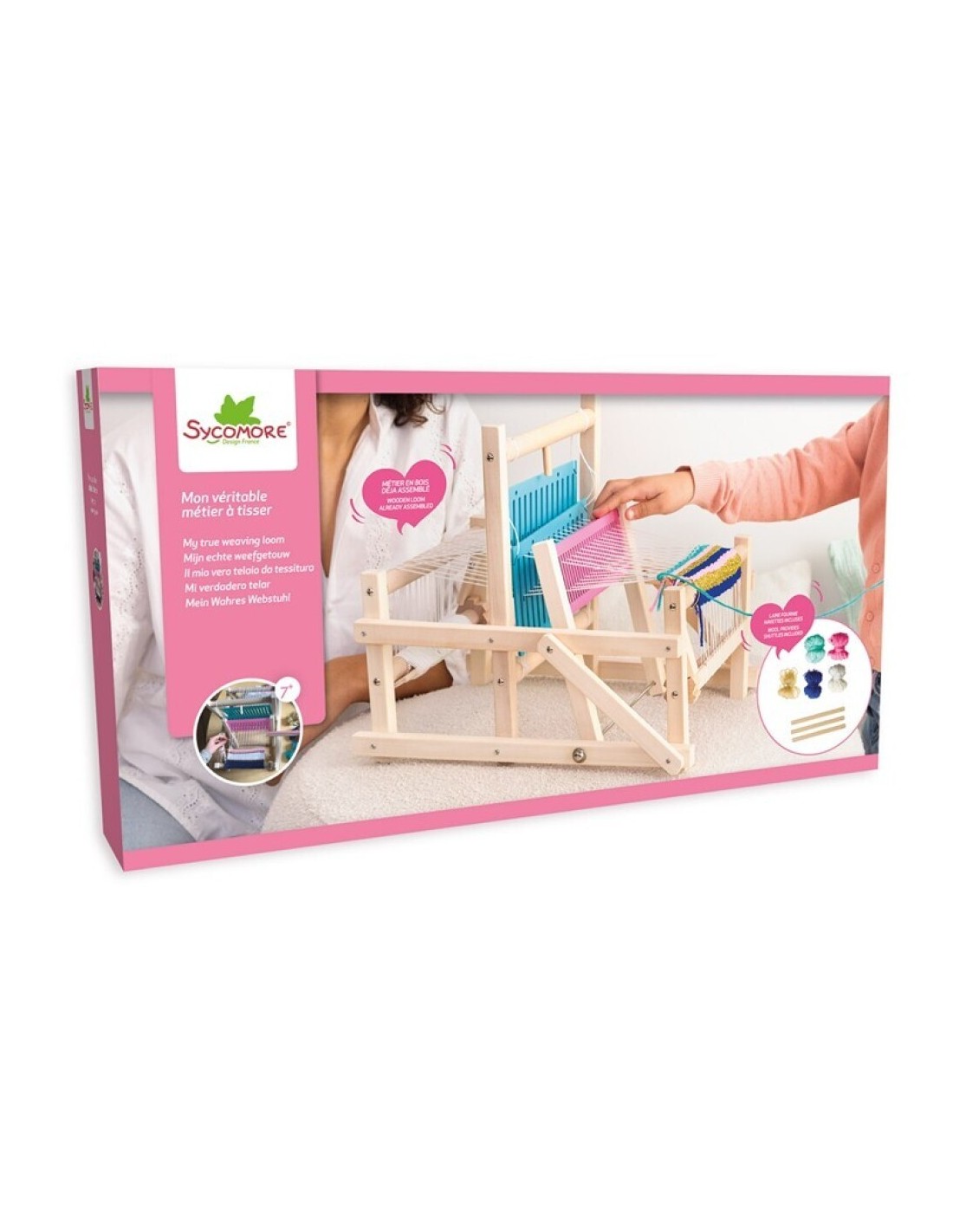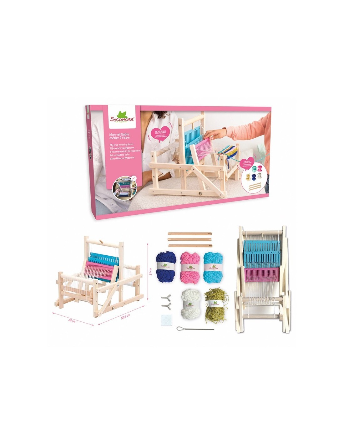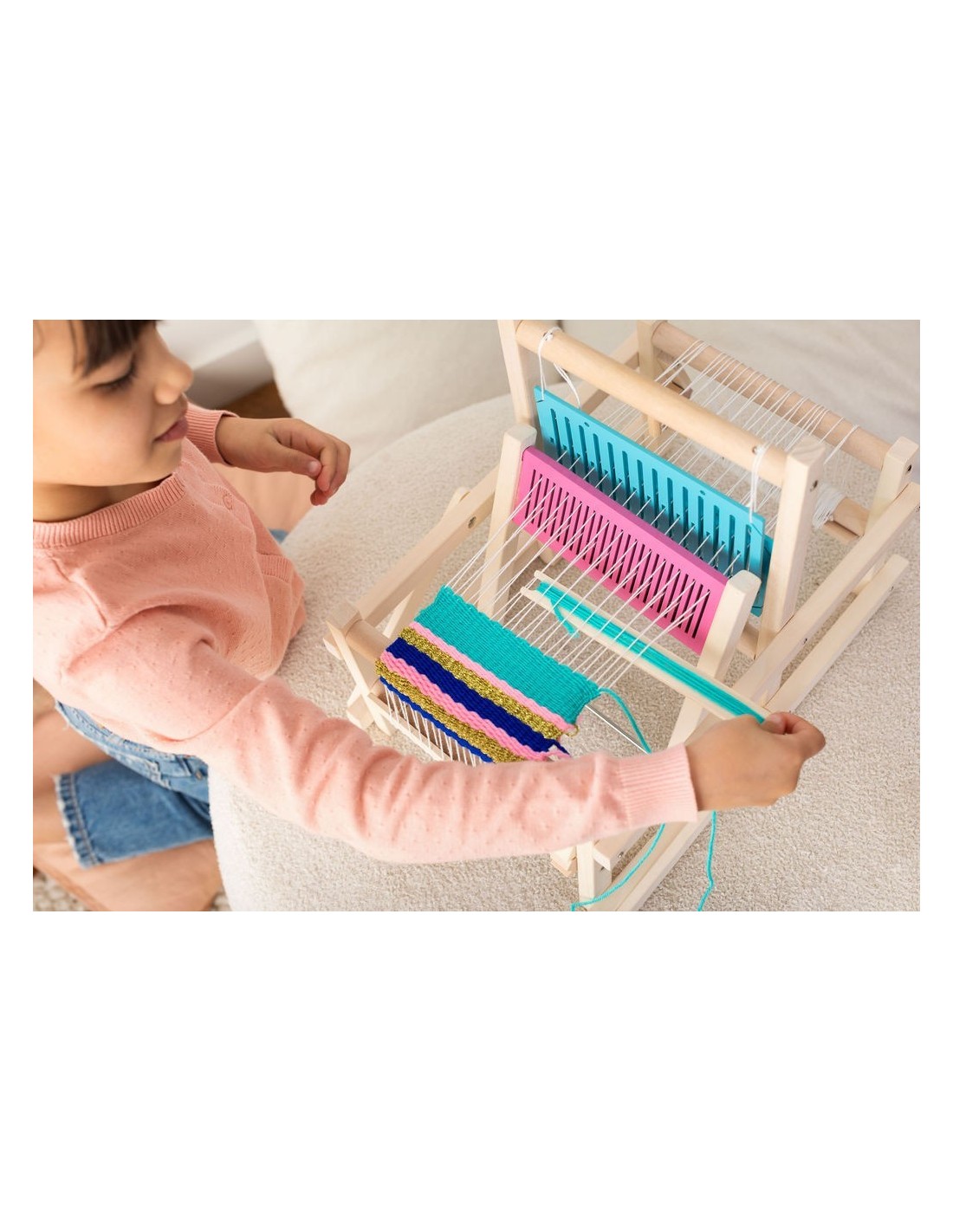 Incluye: 3 lanzaderas, 4 colores de lana, telar listo para usar.