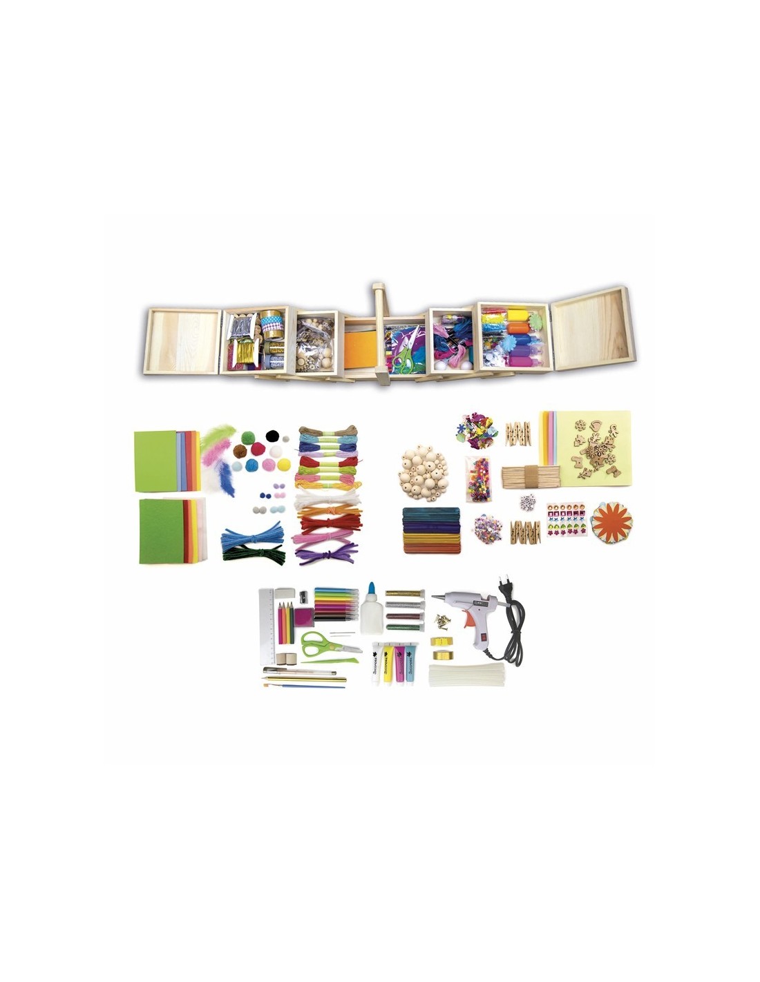 Incluye: rotuladores, lápices de colores, papel, pompones, plumas, pedrería, lentejuelas, tijeras, goma de borrar, regla, sacapuntas, cinta de carrocero, espuma, hilo de chenilla, hilo de algodón, sujetadores parisinos, pinzas para la ropa, cuentas de hierro, cuentas de madera, formas de madera, bolígrafo dorado, cola blanca, pintura, pincel, pistola de pegamento…