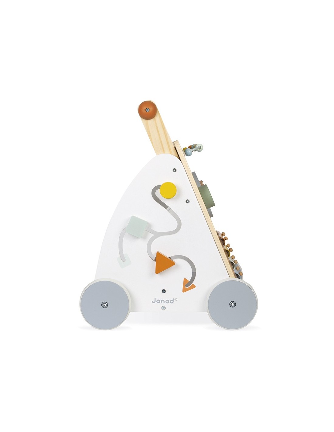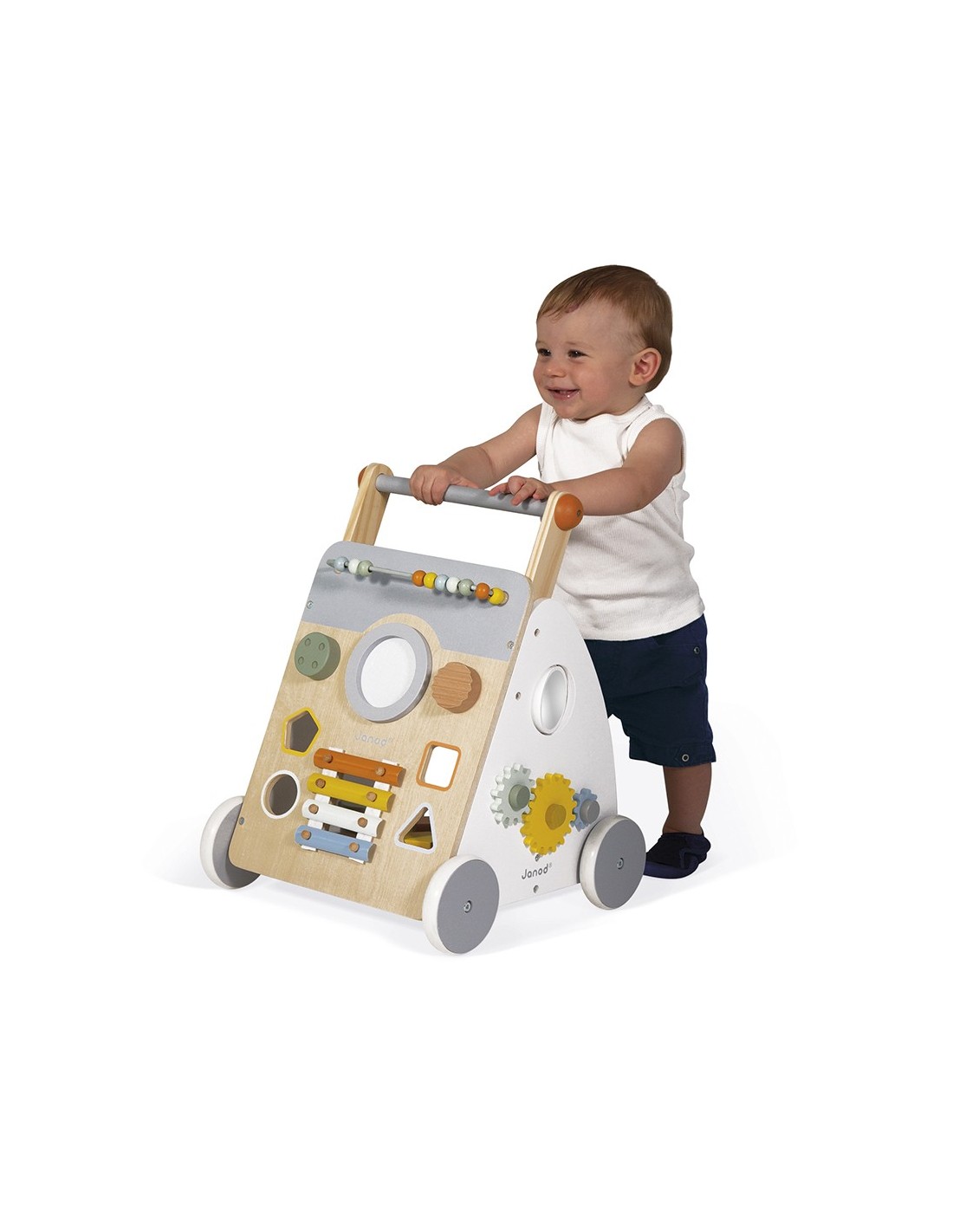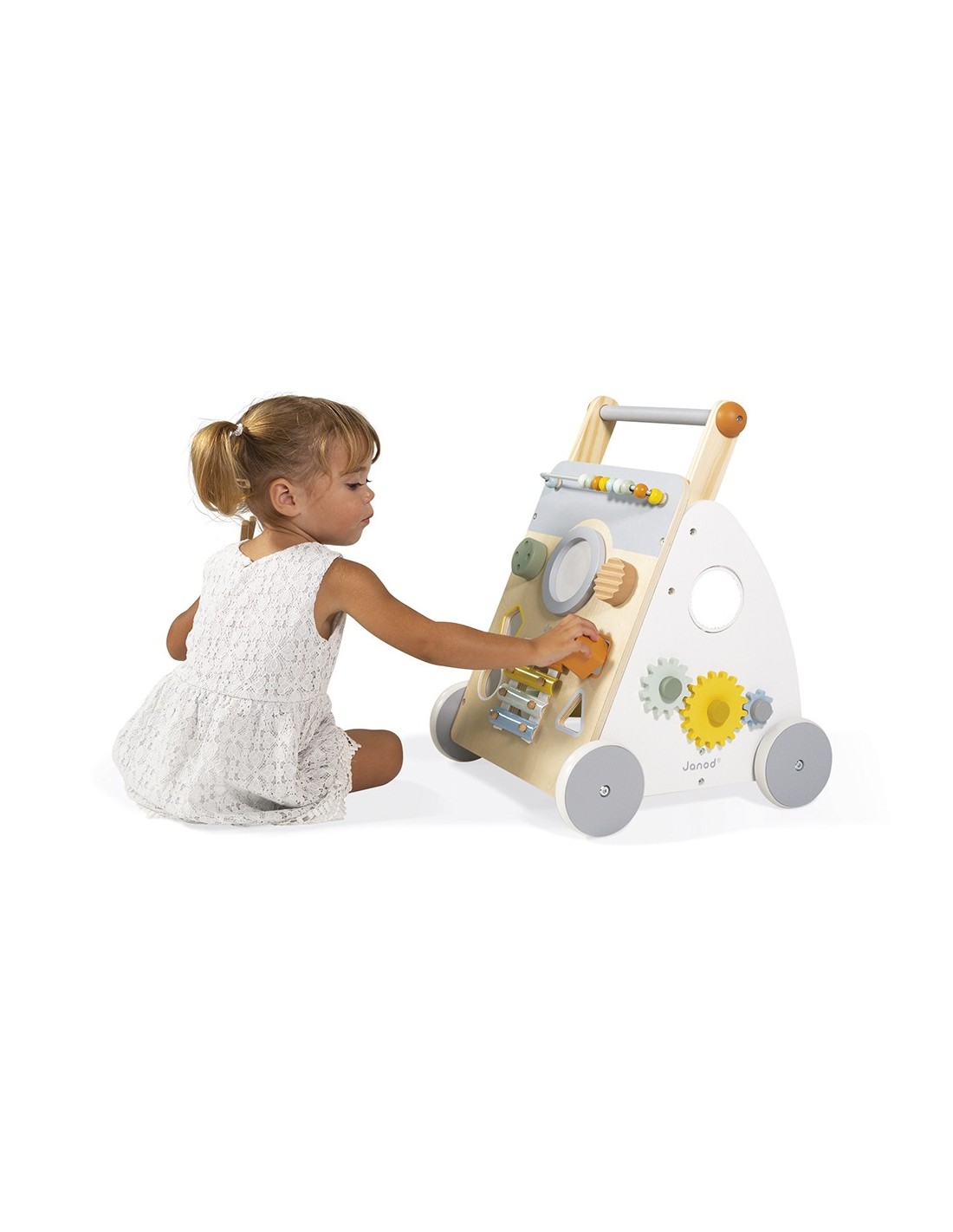 Este bonito carrito de empuje multiactividades está pensado especialmente para aprender a andar. Acompañará al niño con total seguridad ya que su freno invisible y desmontable permite bloquear las ruedas y liberarlas gradualmente con el fin de controlar la velocidad del carrito durante el aprendizaje. Además de caminar, el niño podrá poner a prueba su motricidad fina y su destreza con las 9 actividades lúdicas posibles: ábaco, caja de formas, laberinto, engranajes, botón giratorio con sonido, «rascador», espejo giratorio de aumento, tambor y xilófono metálico para estimular su sensibilidad musical. Este carrito tan ingenioso lleva una alfombrilla de fieltro para atenuar el ruido y amortiguar la caída de los cubos. ¡Y además las ruedas son silenciosas!