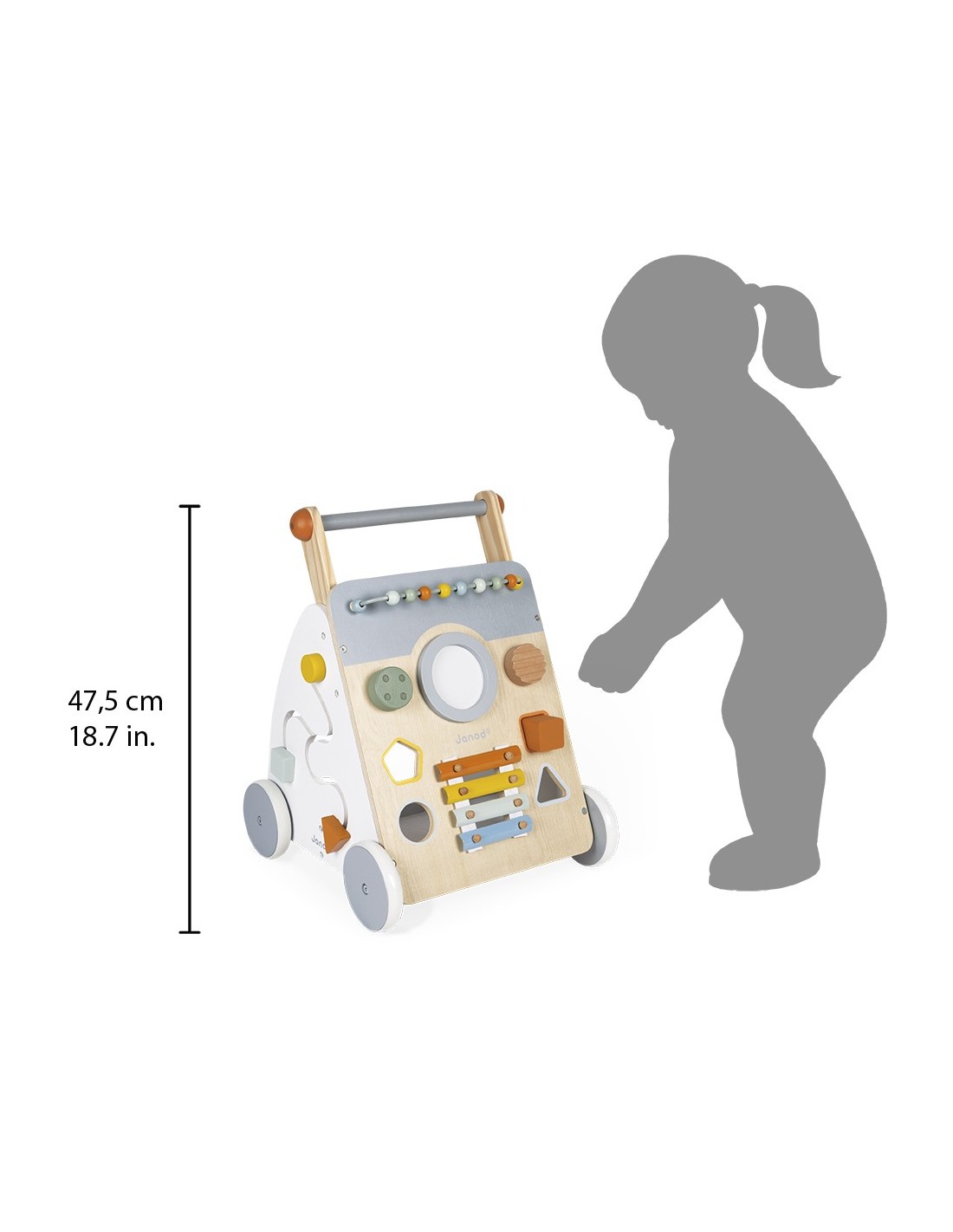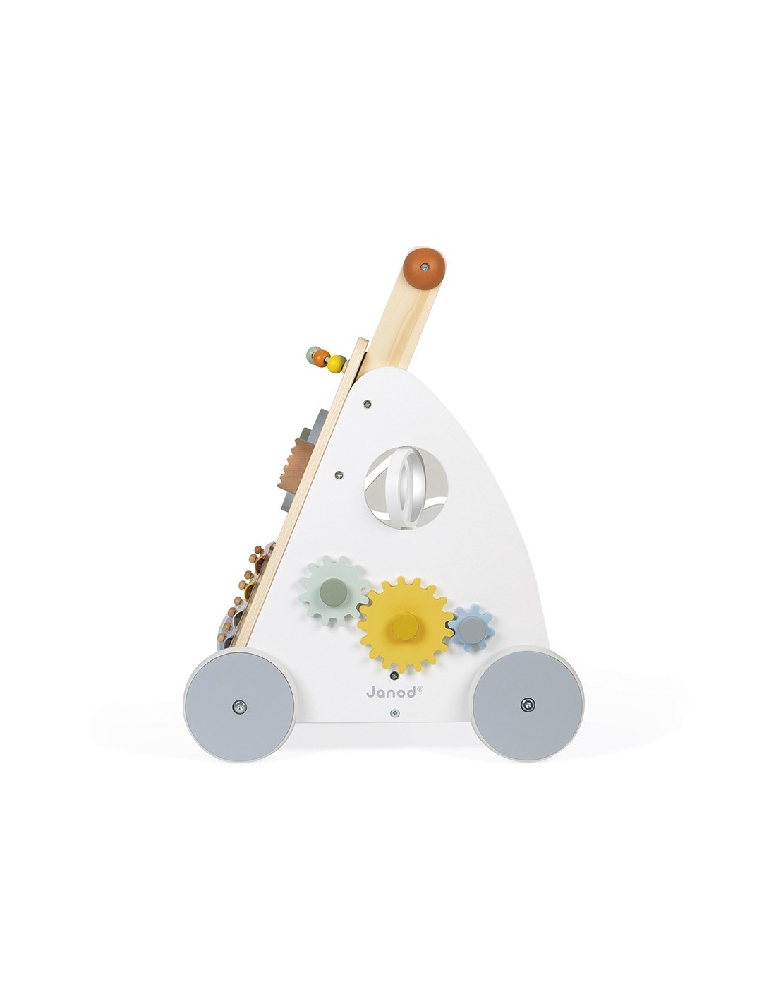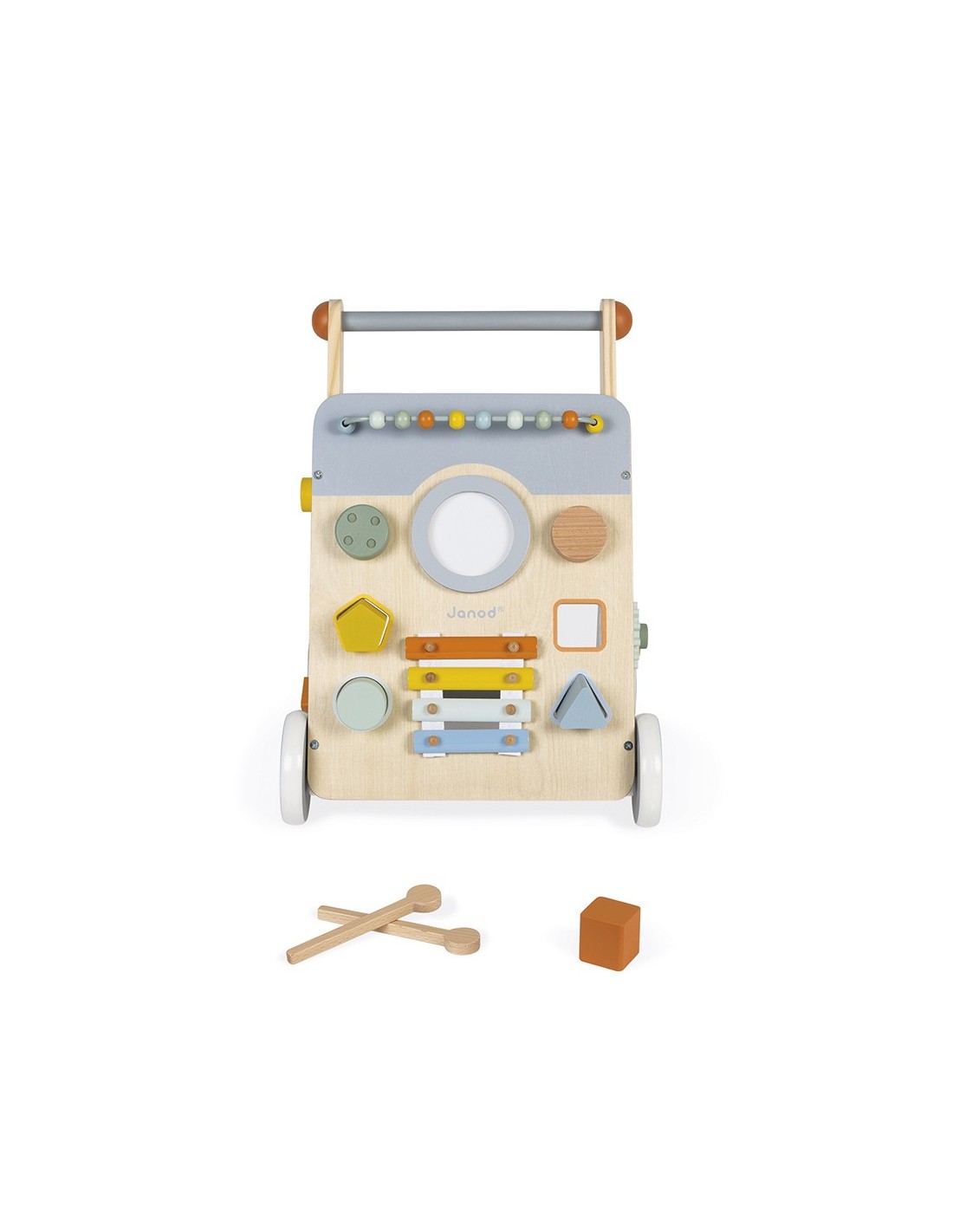 Este bonito carrito de empuje multiactividades está pensado especialmente para aprender a andar. Acompañará al niño con total seguridad ya que su freno invisible y desmontable permite bloquear las ruedas y liberarlas gradualmente con el fin de controlar la velocidad del carrito durante el aprendizaje. Además de caminar, el niño podrá poner a prueba su motricidad fina y su destreza con las 9 actividades lúdicas posibles: ábaco, caja de formas, laberinto, engranajes, botón giratorio con sonido, «rascador», espejo giratorio de aumento, tambor y xilófono metálico para estimular su sensibilidad musical. Este carrito tan ingenioso lleva una alfombrilla de fieltro para atenuar el ruido y amortiguar la caída de los cubos. ¡Y además las ruedas son silenciosas!