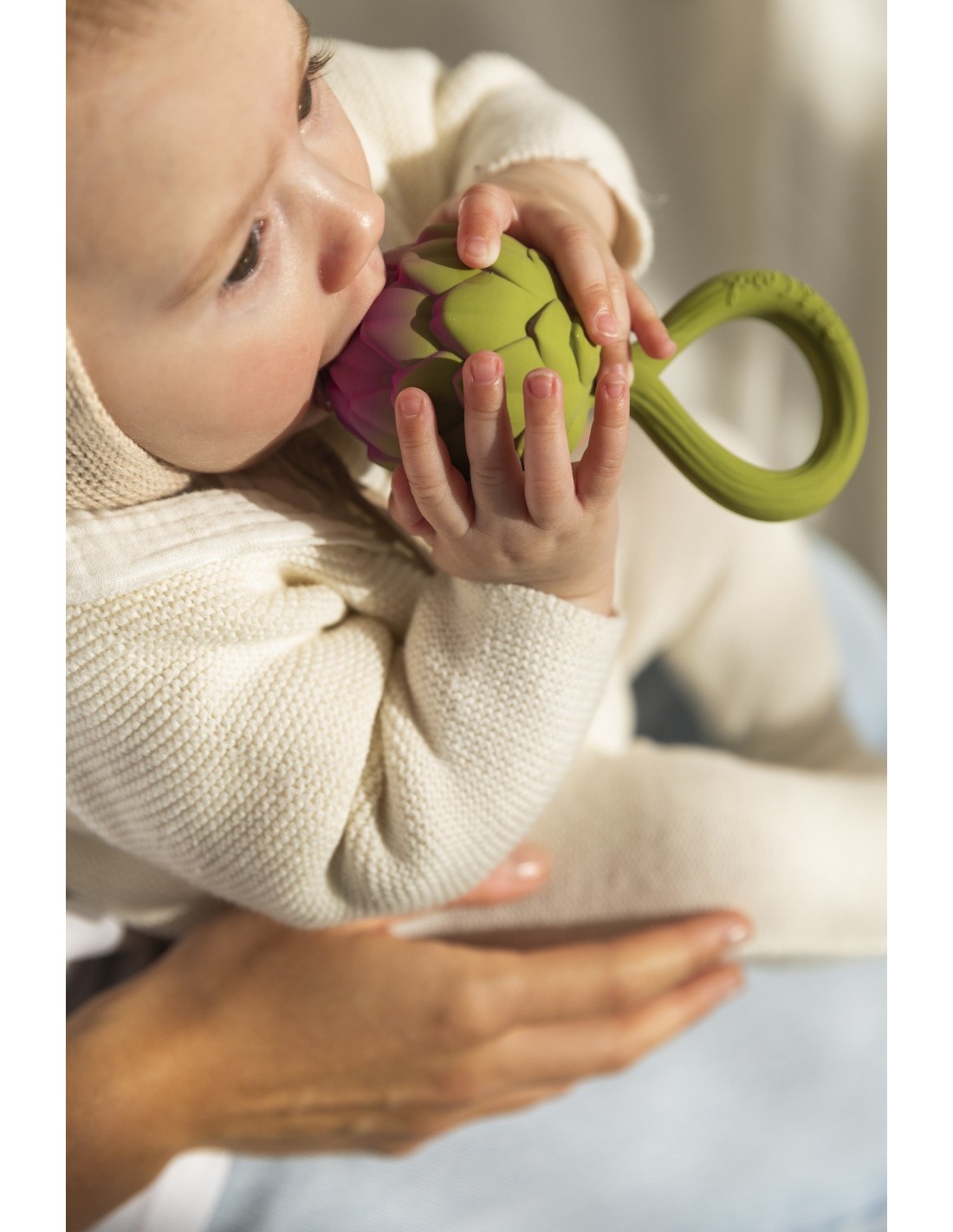 El exterior del sonajero Artichoke está hecho de caucho 100% natural, y en su interior hay semillas de cereza recicladas que lo convierten en un sonajero.