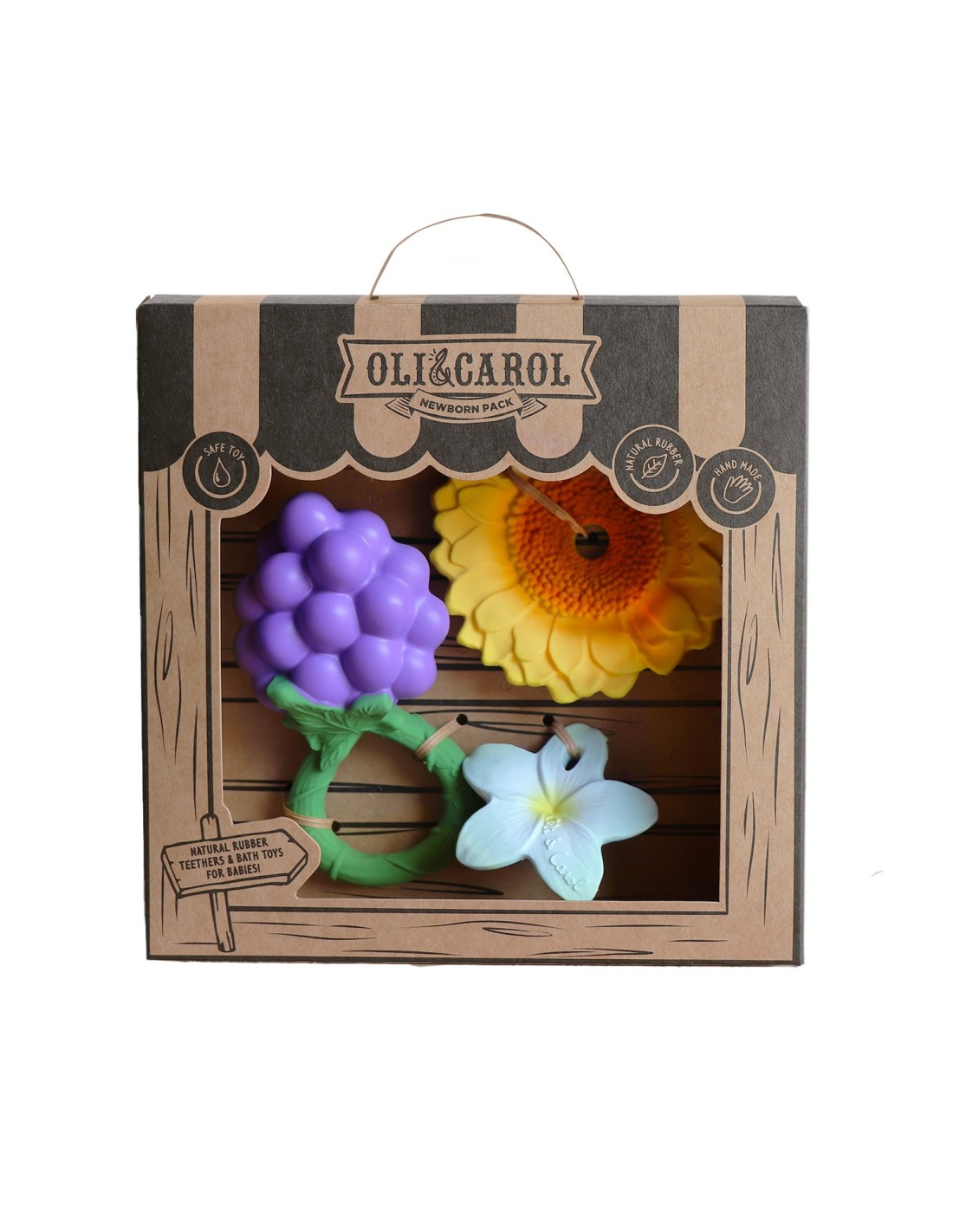 Este pack de regalo de nacimiento incluye el mordedor Sunflower, el sonajero Grape y el mini mordedor Bali the flower. ¿Sabías que los sonajeros de Oli&Carol están hechos con semillas de cereza recicladas que hacen un sonido que calma a los bebés? Los mordedores son fáciles de coger y morder para las manitas de los más pequeños, y los mini mordedores están diseñados para el paladar de los recién nacidos. Este set viene con un packaging hecho a medida, ¡listo para regalar!