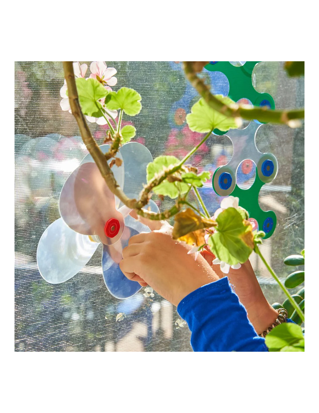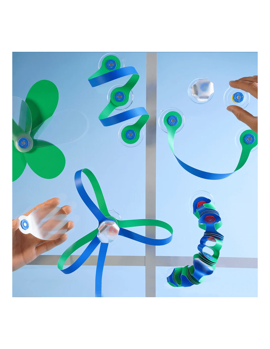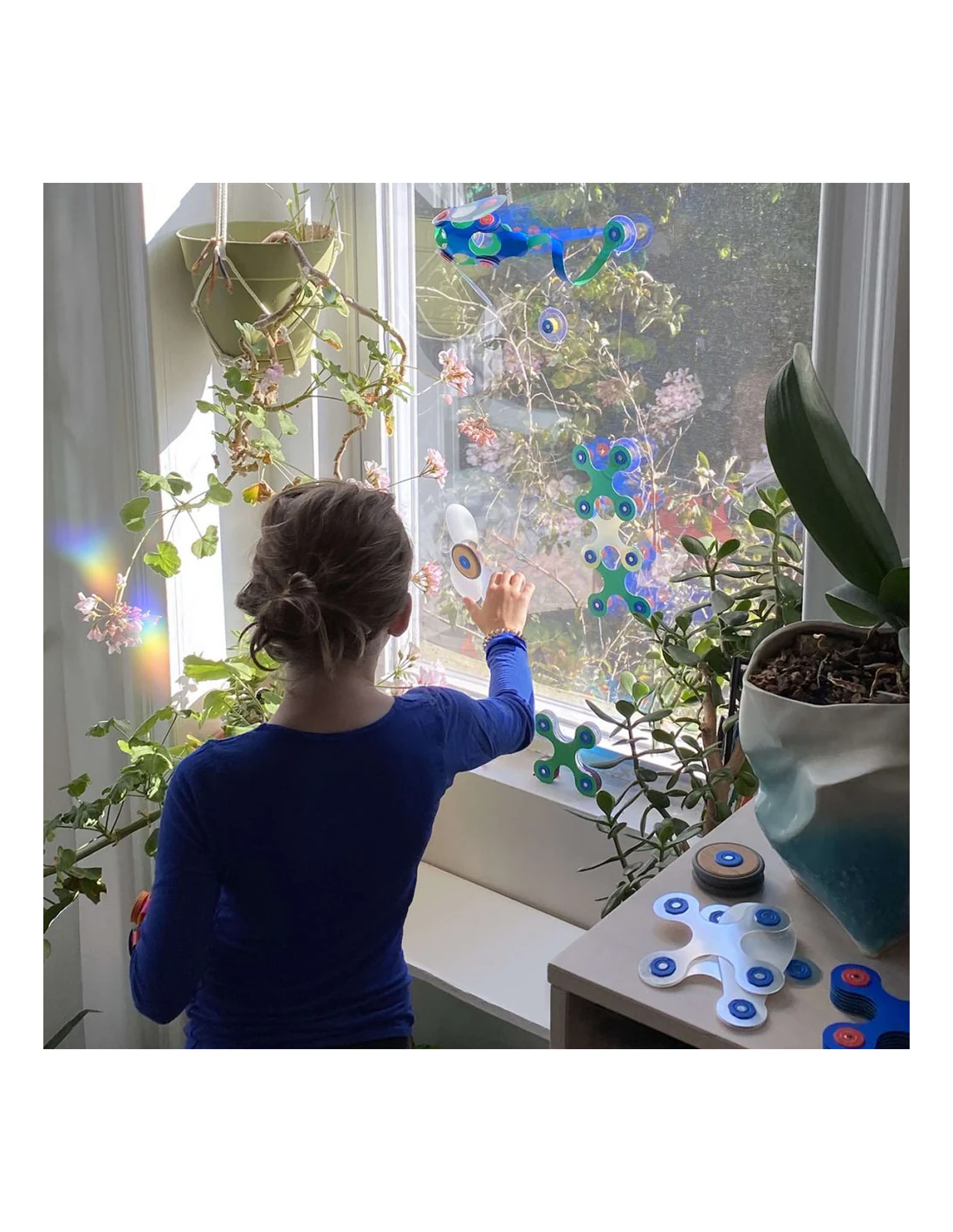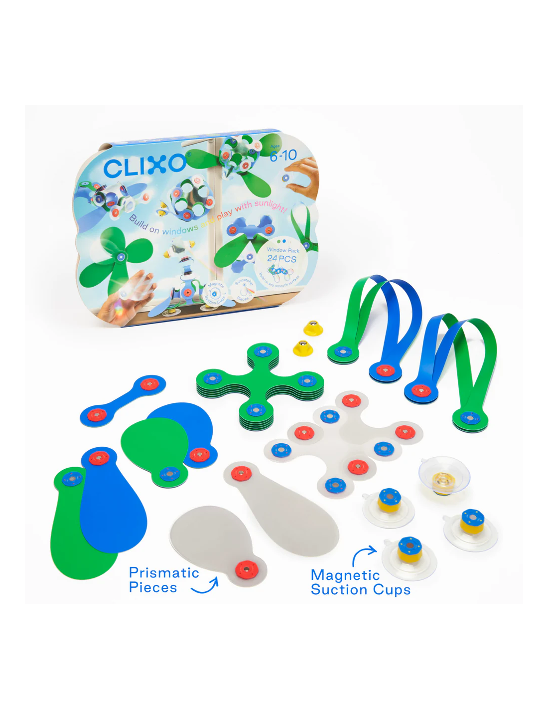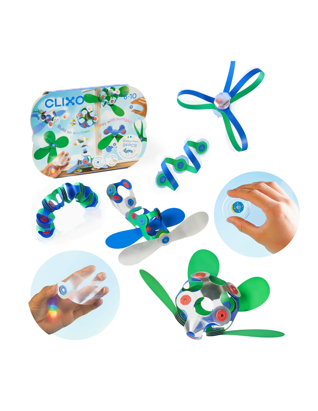Este pack contiene 24 piezas en 10 formas únicas, incluidos los accesorios de ventosa (x4). Los niños podrán construir caras divertidas, tubos colgantes o estructuras en ventanas y azulejos gracias a sus piezas holográficas que refractan la luz y crean arcoíris.