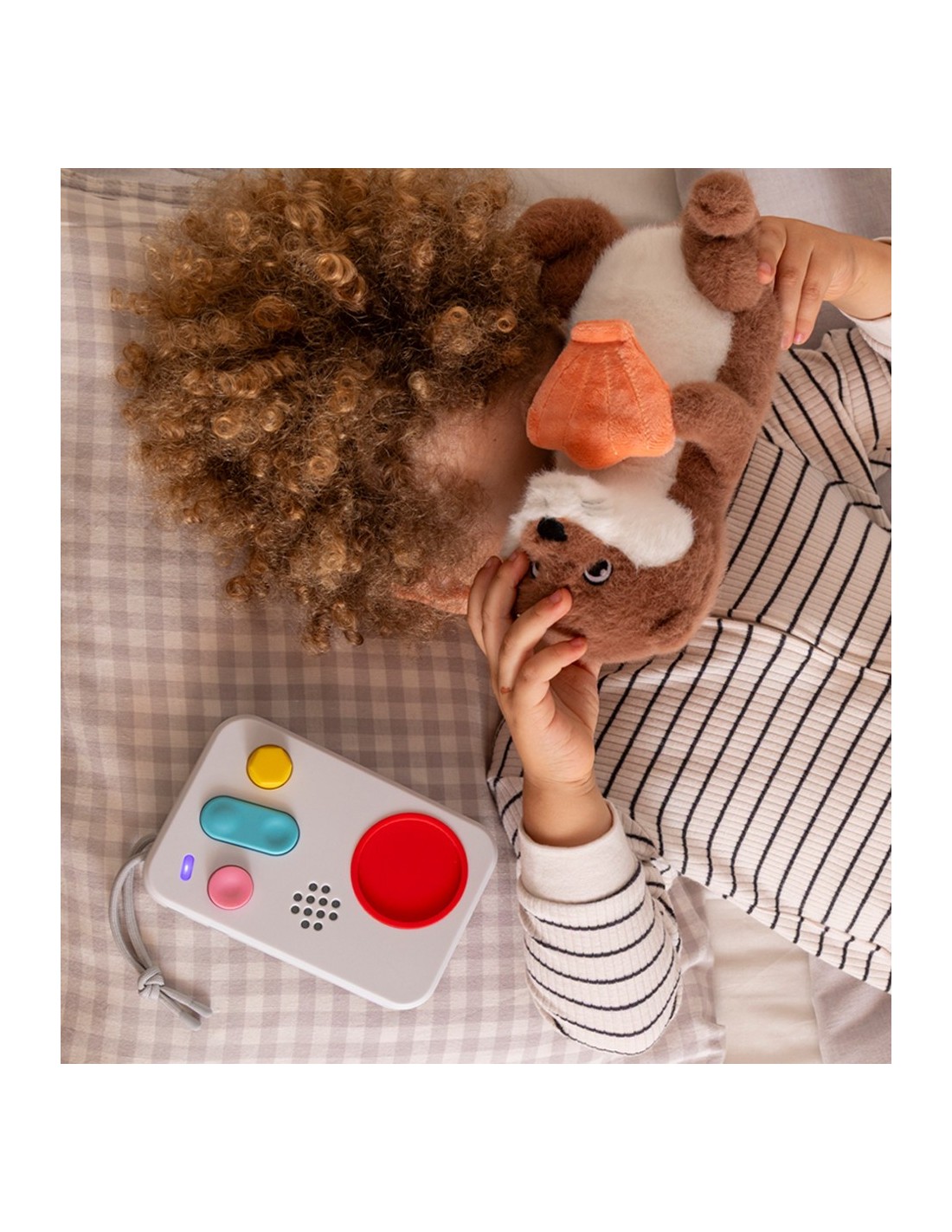 Un tierno peluche que en su concha guarda un disco sonoro con 8 historias breves en rima, dulces y apasionantes, escritas en colaboración con una pedagoga, que tratan el tema del apego familiar. Enriquecido con melodías instrumentales y sonidos de la naturaleza, las historias ofrecen una experiencia de audio relajante, perfecta para favorecer los momentos compartidos de calma y mimos.