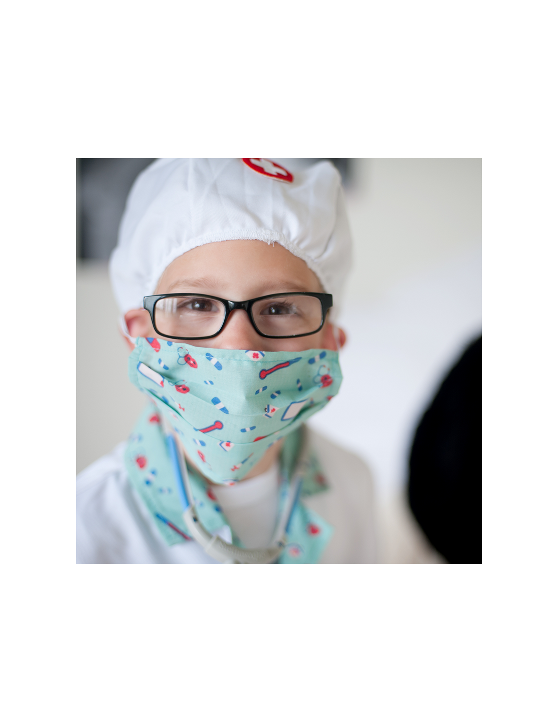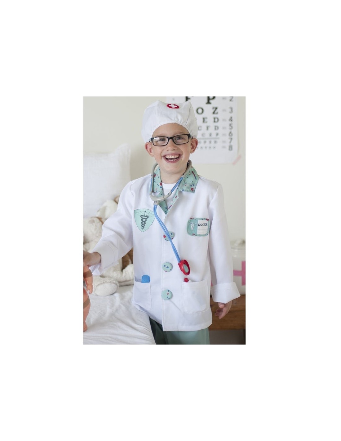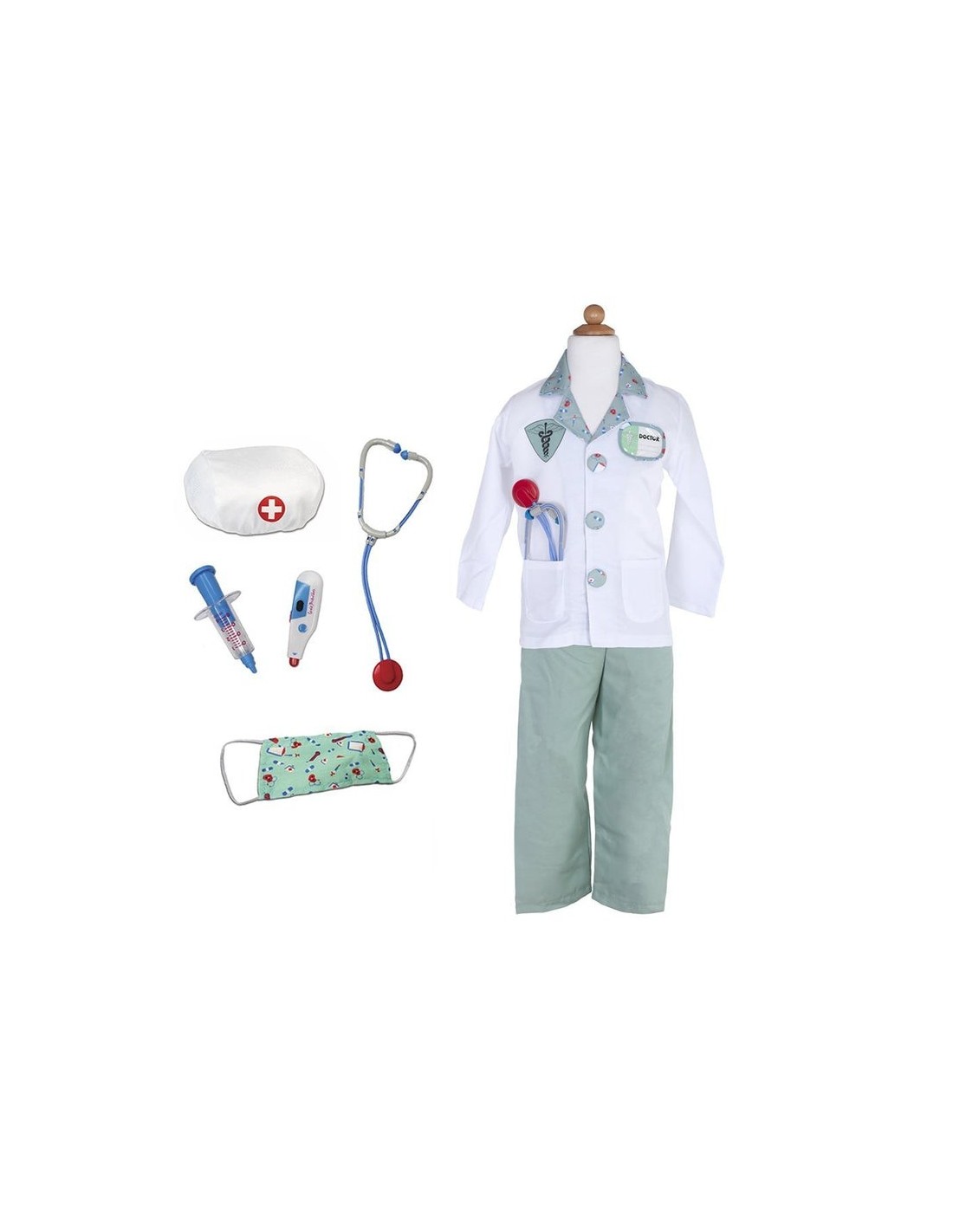 El conjunto incluye una bata blanca, pantalones verdes, una mascarilla de tela verde estampada, un gorro blanco, un estetoscopio, una jeringa y un termómetro. La bata también cuenta con un bolsillo para introducir la etiqueta con el nombre, y velcros para ponerla y quitarla fácilmente. El disfraz incluye una bolsa de tela azul reutilizable para un fácil almacenamiento.