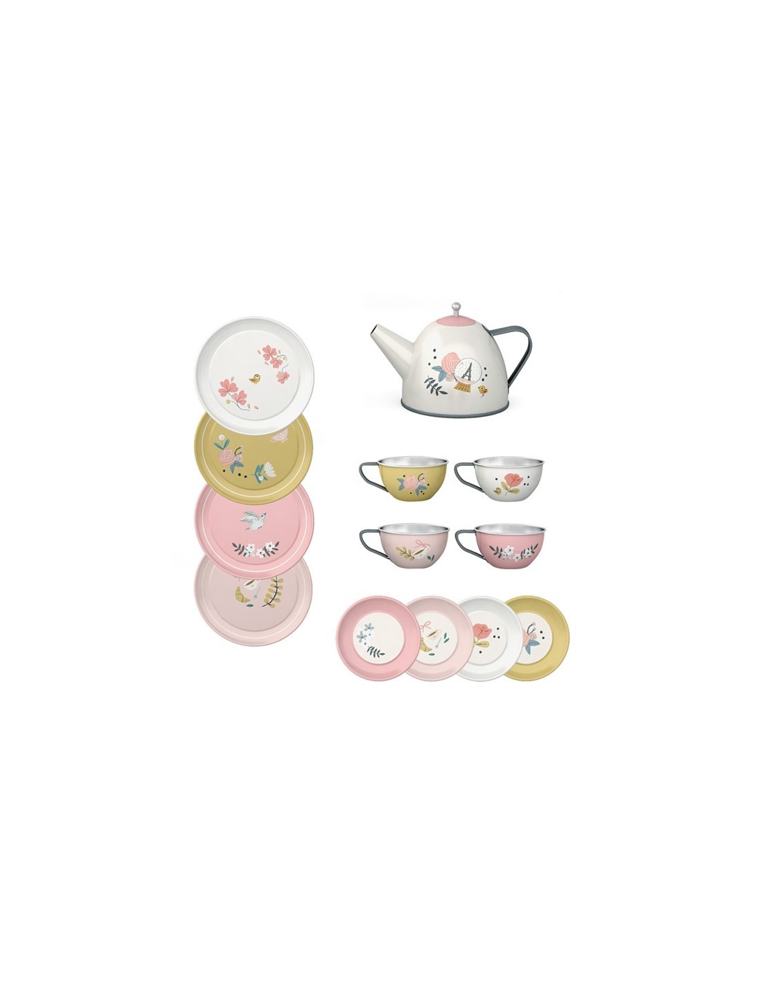 ¡Este maletín de té es pura fantasía! Precioso conjunto de metal que incluye: bandeja, tetera, cuatro platos de postre, cuatro tazas y sus platillos a juego. Todo ello en un bonito maletín de cartón resistente que facilita el poder llevarlo a cualquier sitio.