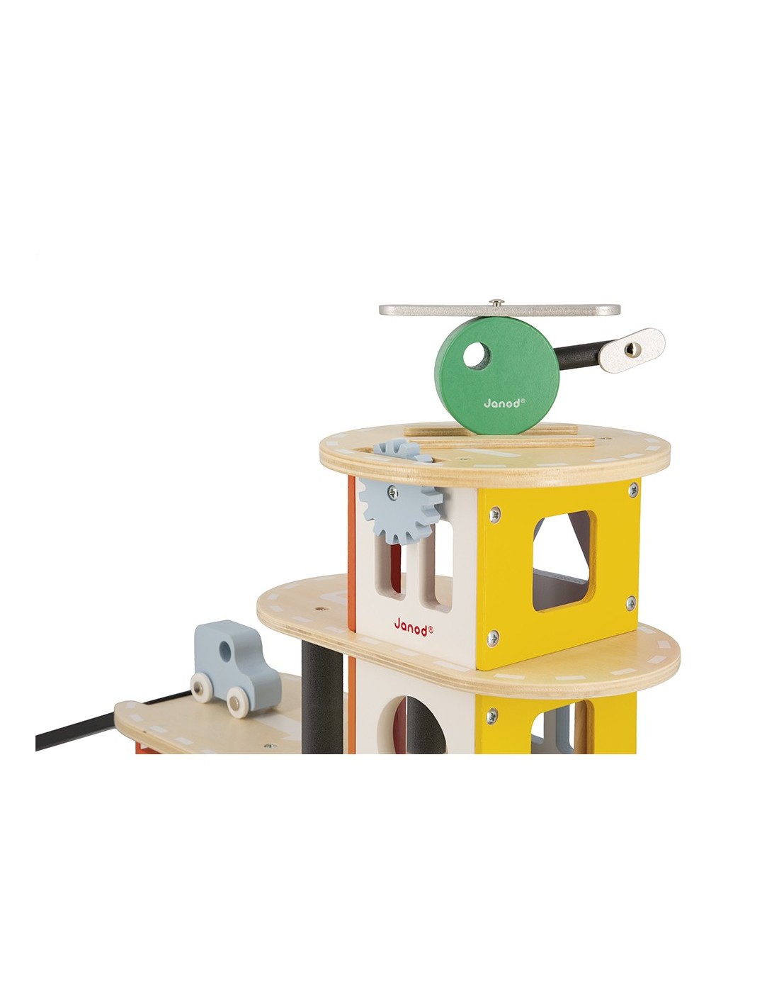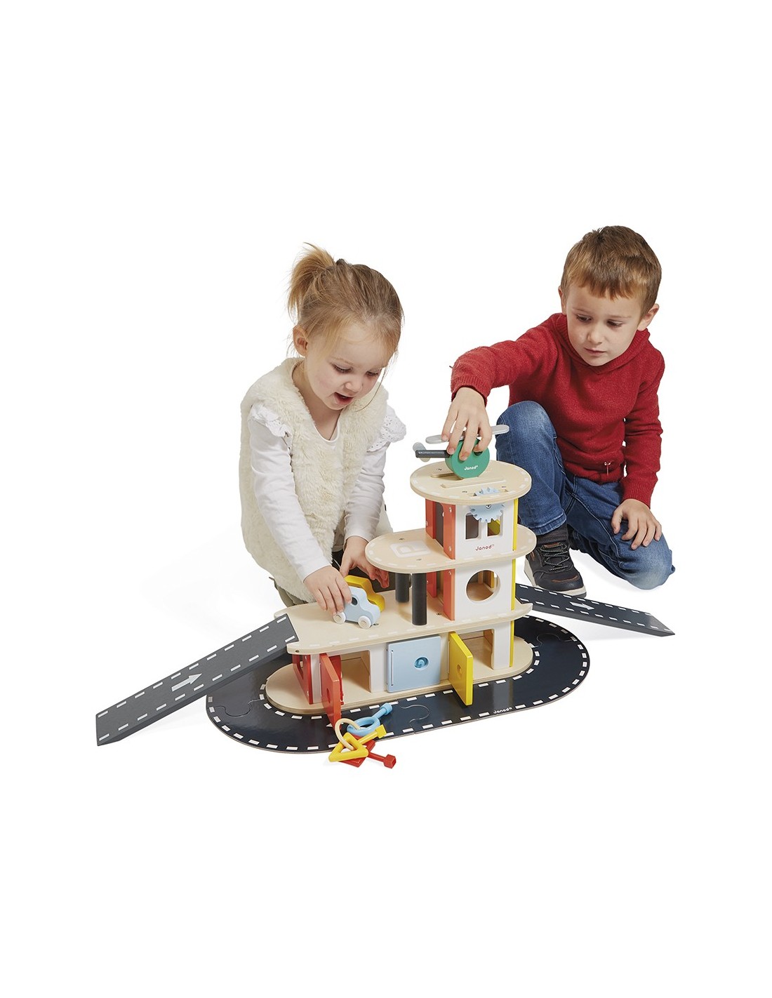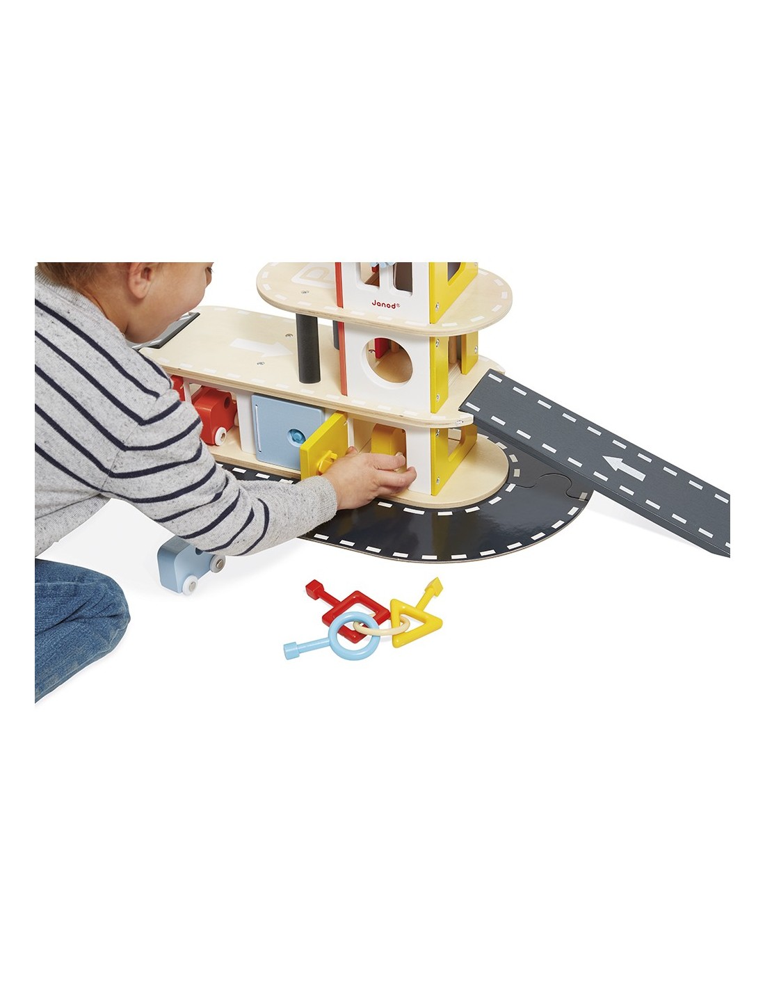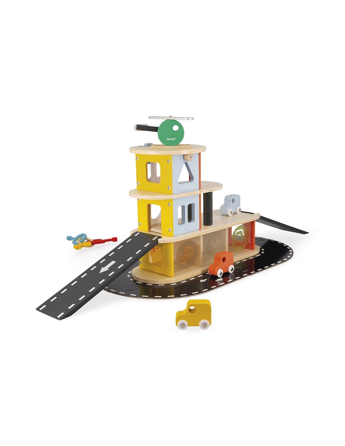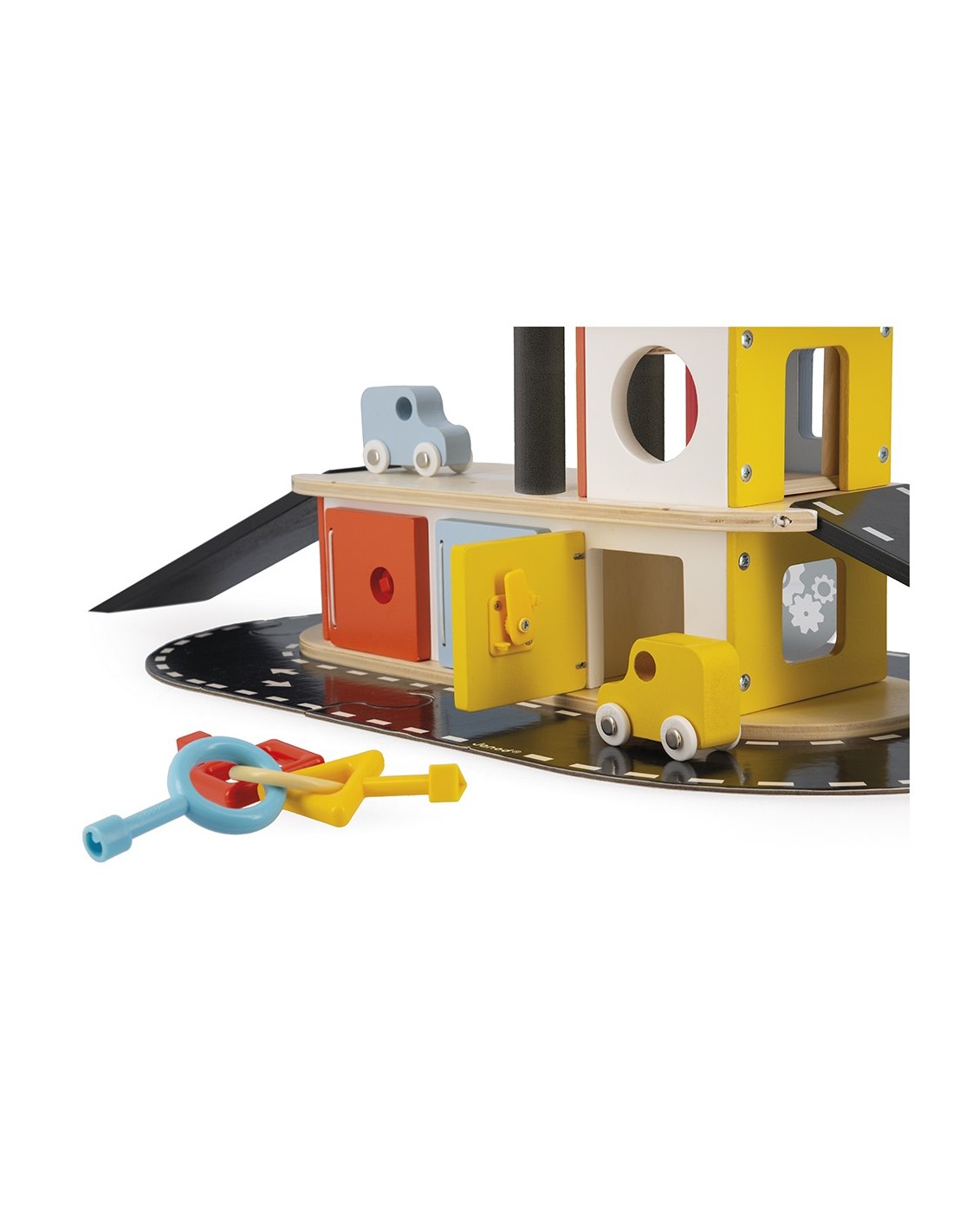 ¡Este es el garaje de madera más guay para niños con sus formas redondeadas y colores brillantes! Con este hermoso juguete de imaginación, tu hijo pasará horas inventando bonitas historias y haciendo rodar todo tipo de vehículos por el garaje. Primero podrá explorar los 3 niveles con los 3 autos y el helicóptero de madera incluidos. ¡El circuito al aire libre y las rampas crean un ambiente propicio para las aventuras más locas! El ascensor mecánico permite elevar los vehículos al nivel del aparcamiento. ¡Además podrán divertirse con una caja de llaves incorporada! Para abrir las puertas del garaje y guardar los coches, primero habrá que elegir la llave correcta y la forma correcta.