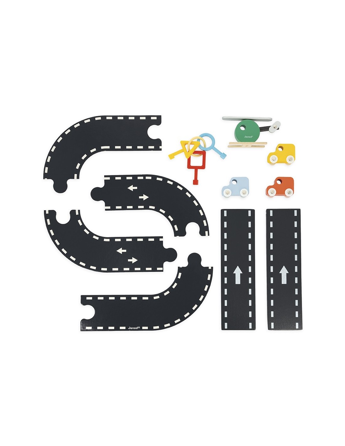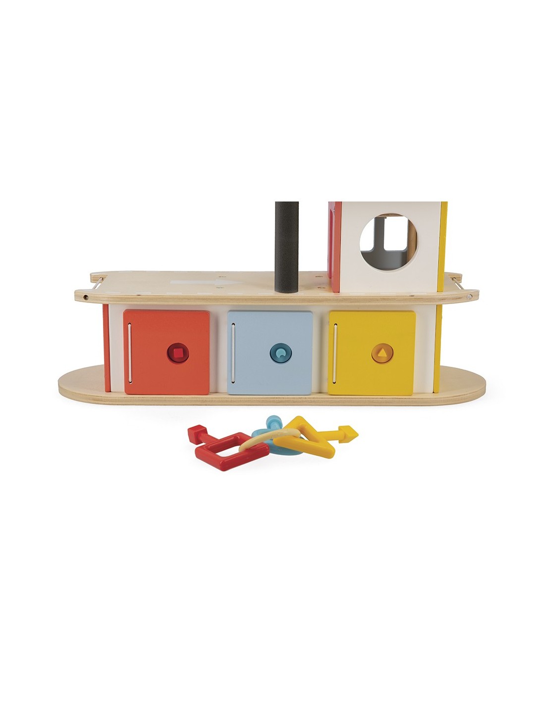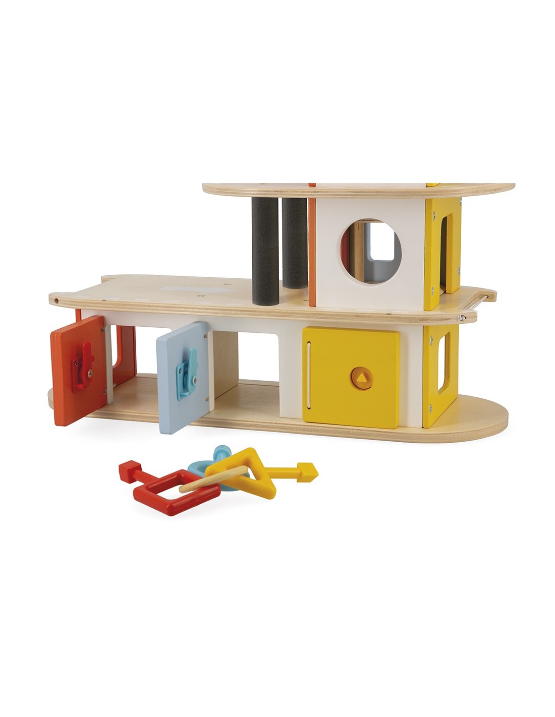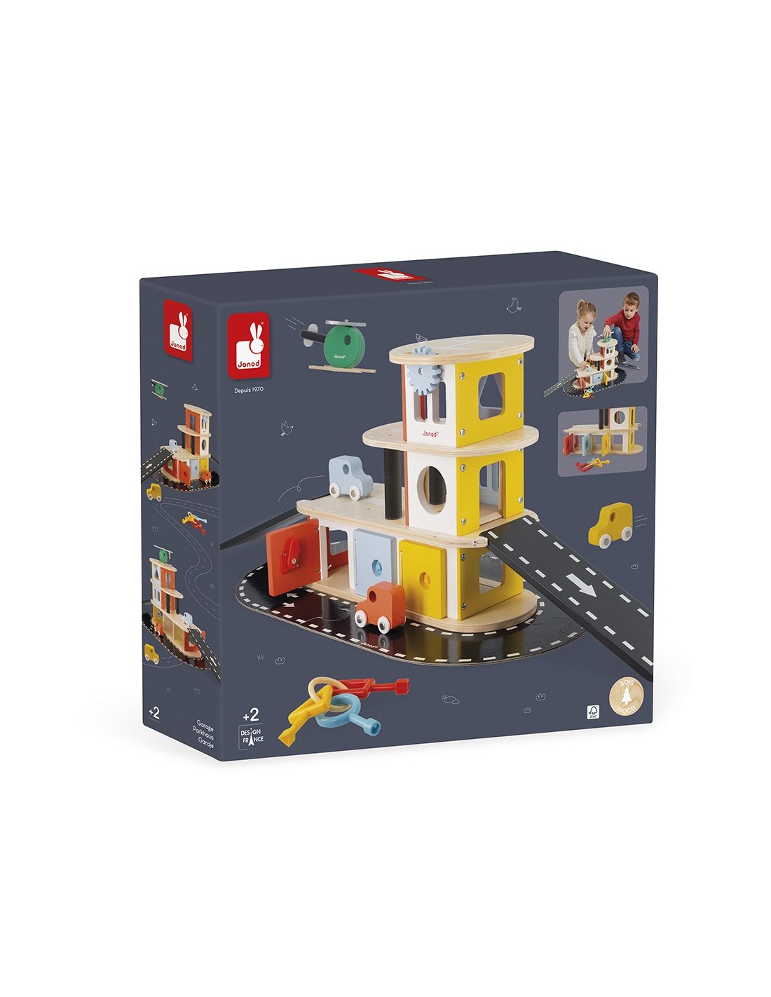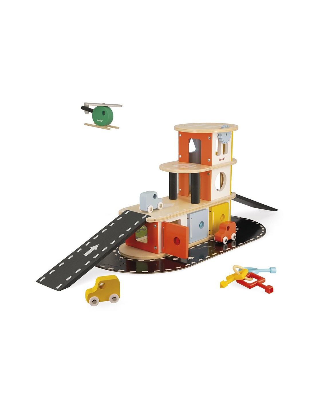 ¡Este es el garaje de madera más guay para niños con sus formas redondeadas y colores brillantes! Con este hermoso juguete de imaginación, tu hijo pasará horas inventando bonitas historias y haciendo rodar todo tipo de vehículos por el garaje. Primero podrá explorar los 3 niveles con los 3 autos y el helicóptero de madera incluidos. ¡El circuito al aire libre y las rampas crean un ambiente propicio para las aventuras más locas! El ascensor mecánico permite elevar los vehículos al nivel del aparcamiento. ¡Además podrán divertirse con una caja de llaves incorporada! Para abrir las puertas del garaje y guardar los coches, primero habrá que elegir la llave correcta y la forma correcta.