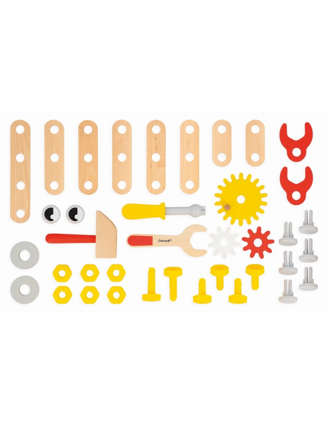 Un total de 38 accesorios de bricolaje completan este carrito: 18 accesorios de madera (placas, engranajes), 20 accesorios de plástico (tornillos, tuercas y clavos). Los tornillos tienen muescas para mayor realismo.