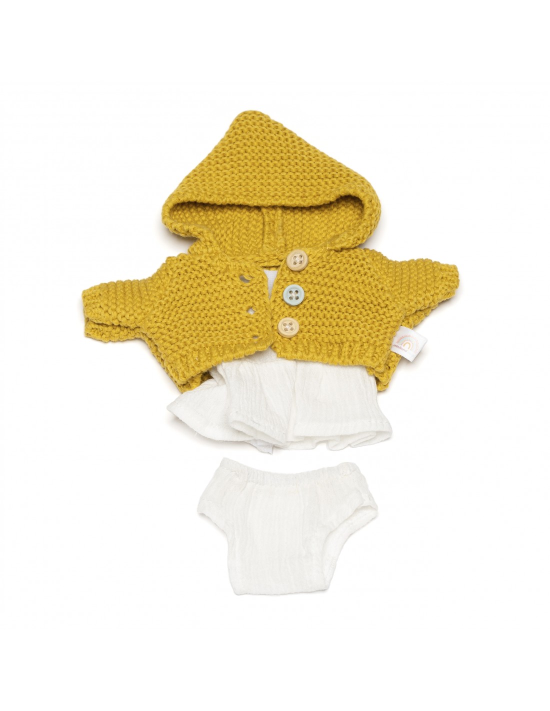 Prepara a tu muñeco para un día lleno de diversión con el conjunto Sea. Este adorable conjunto cuenta con una chaqueta amarilla con capucha estilo handmade, un vestido y un pantalón blanco, perfectos para cualquier ocasión.