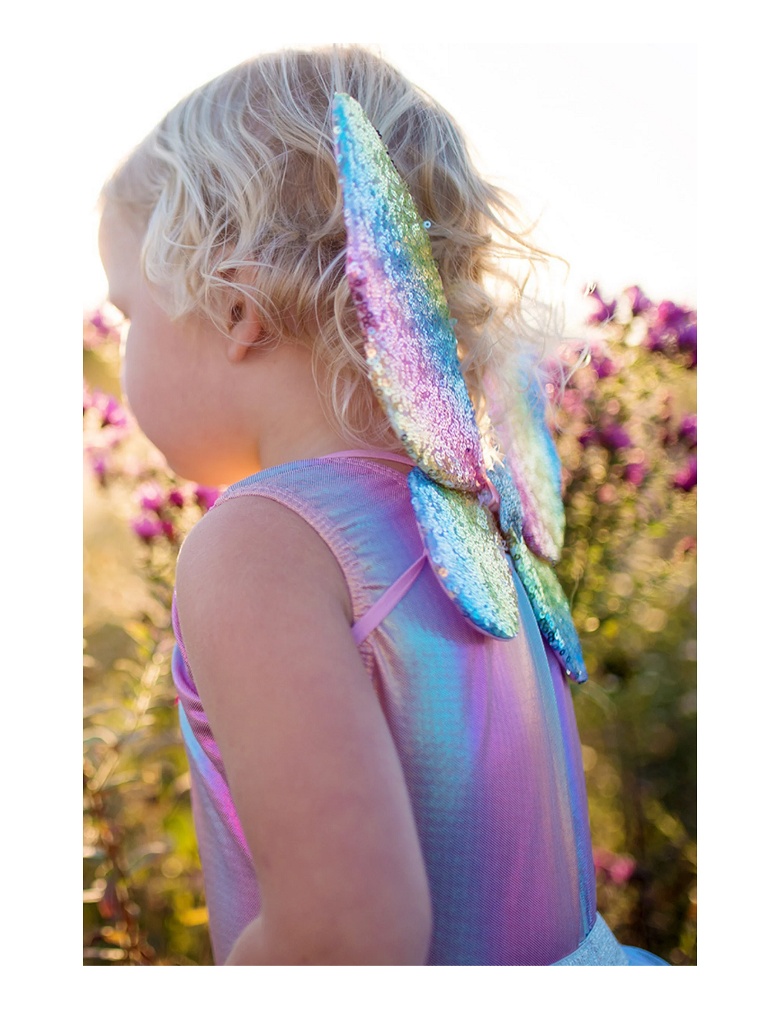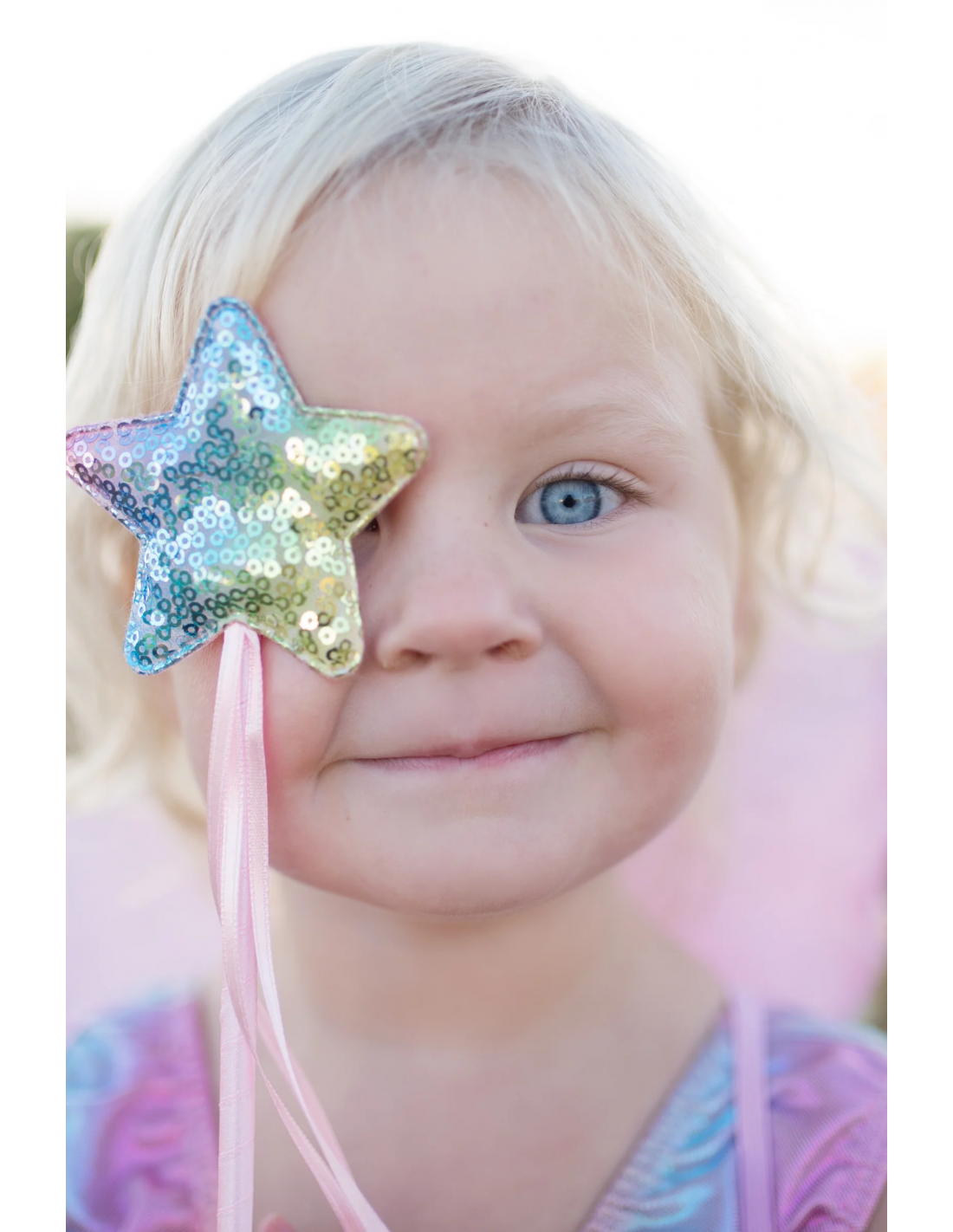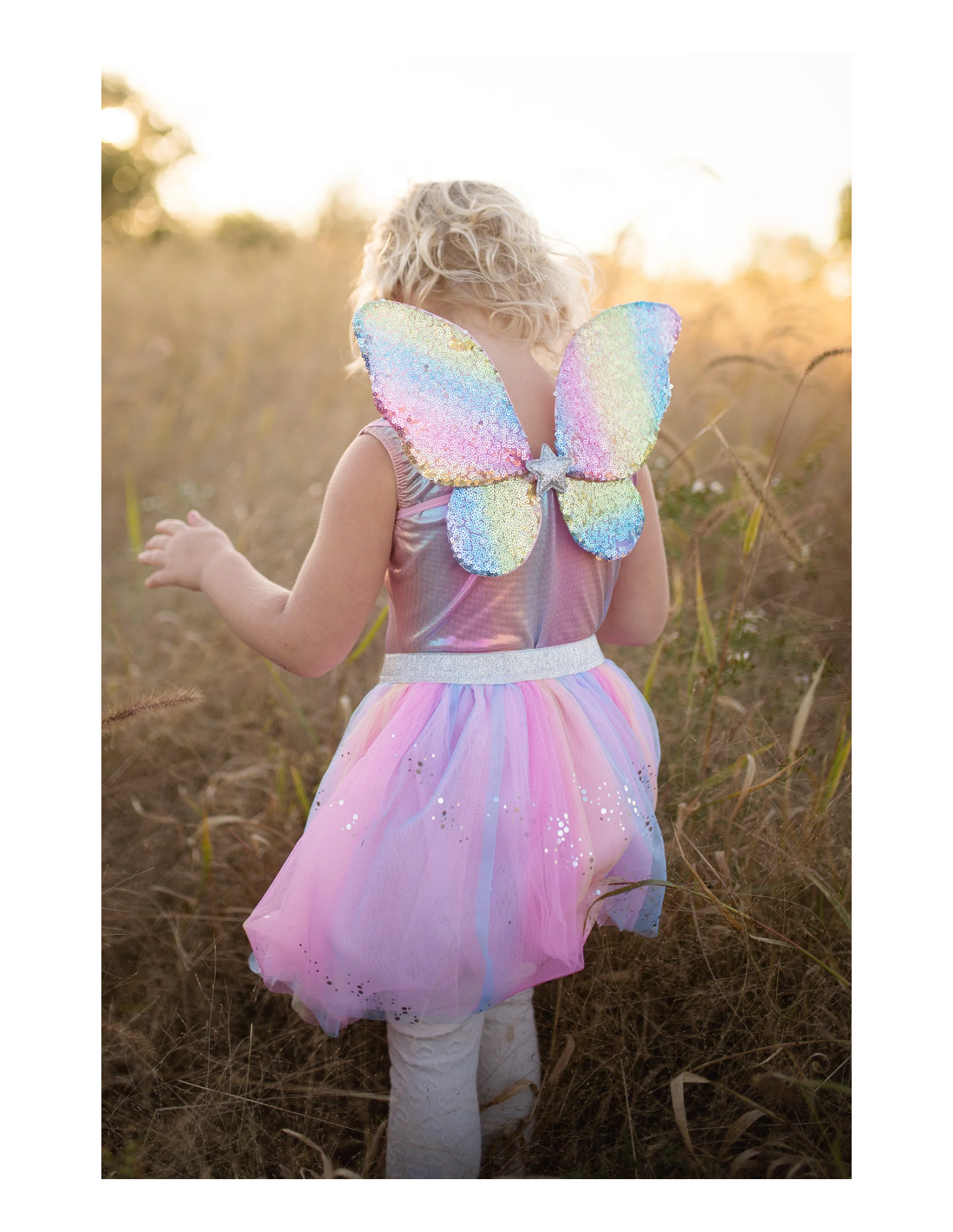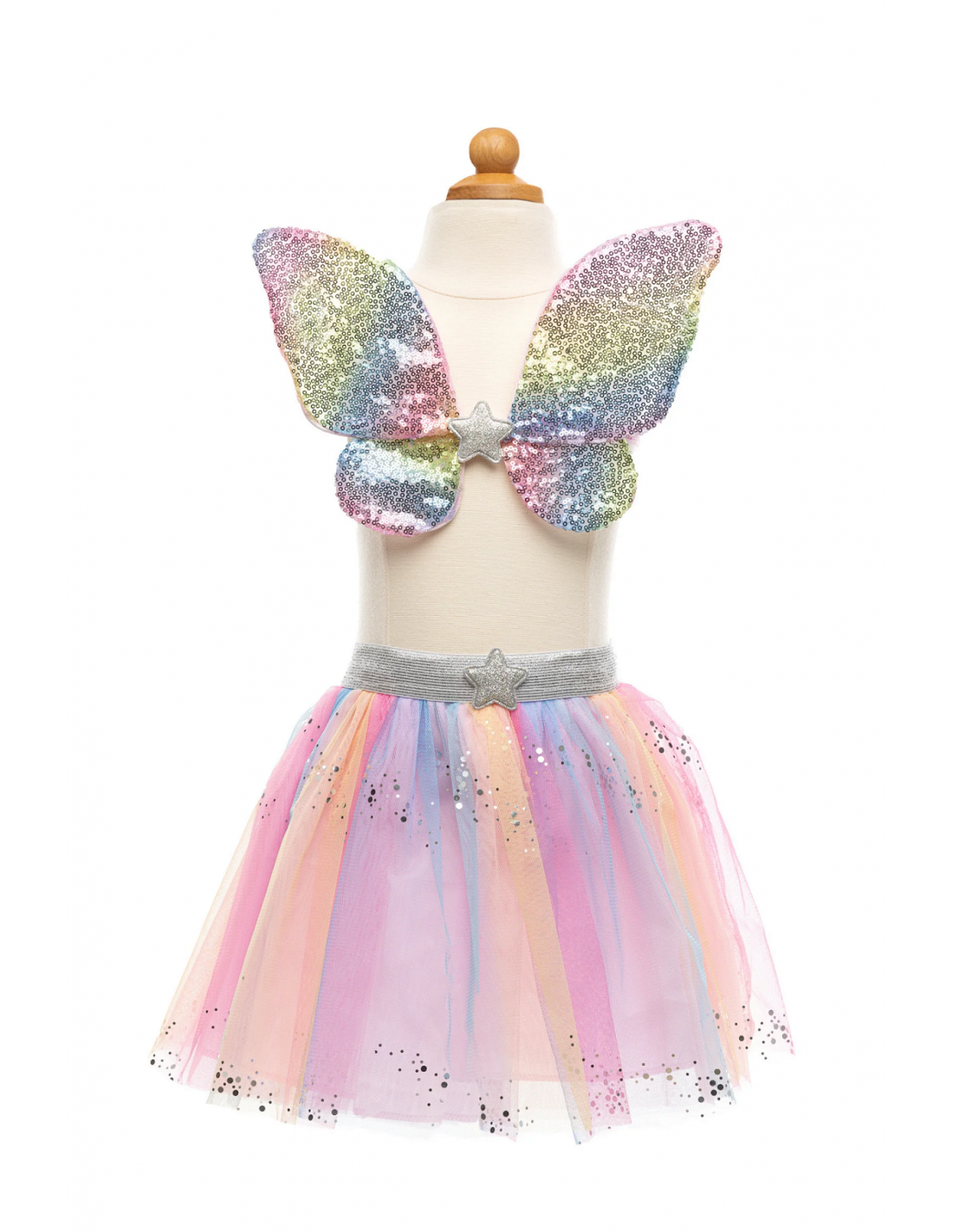 ¡Déjales brillar con este conjunto! Este juego incluye una falda arcoíris multicolor de capas con efecto extra brillante, una varita de estrella cubierta de lentejuelas con cintas fluidas selladas en caliente y alas cubiertas con lentejuelas de arcoíris y forradas con un hermoso satén rosa.