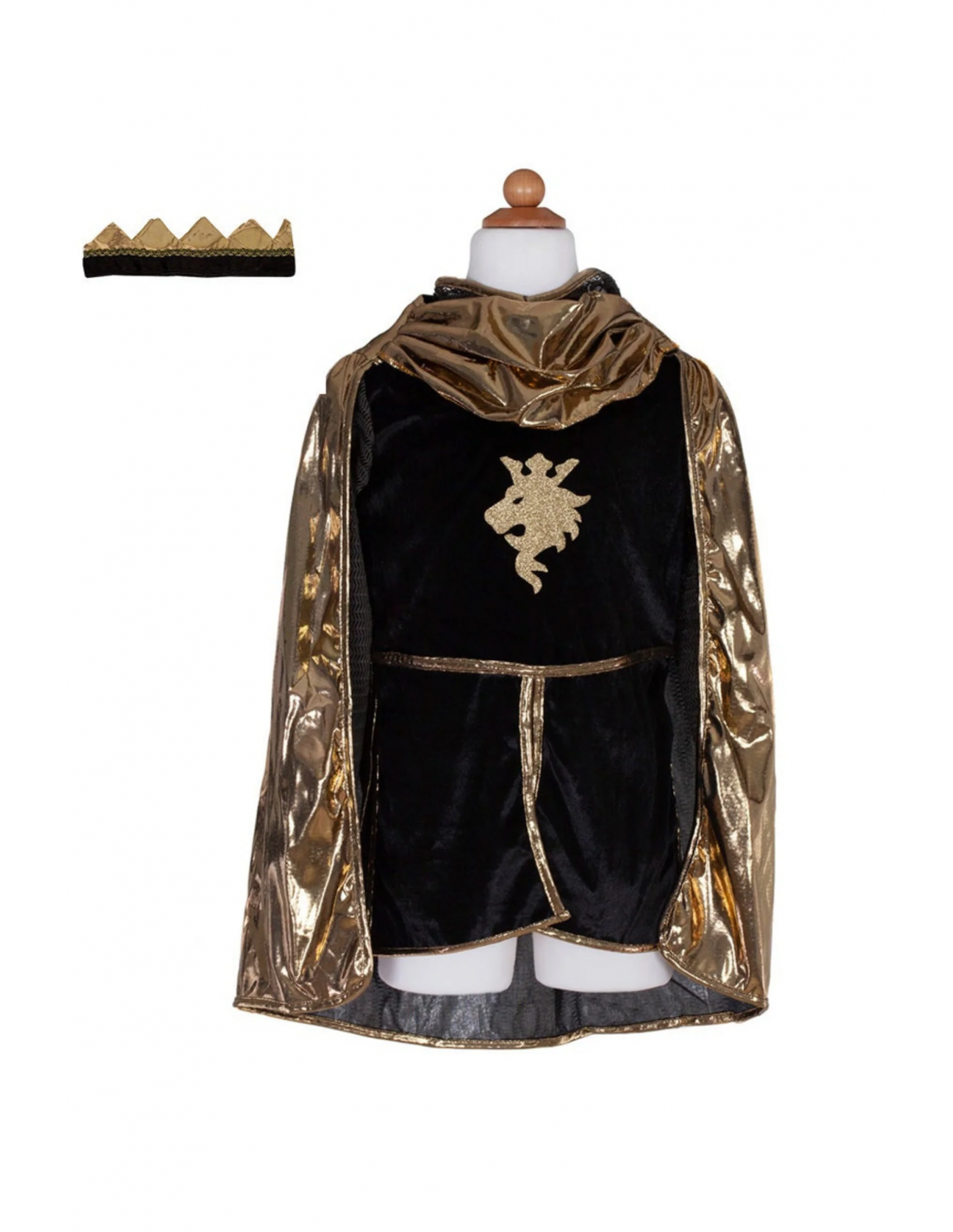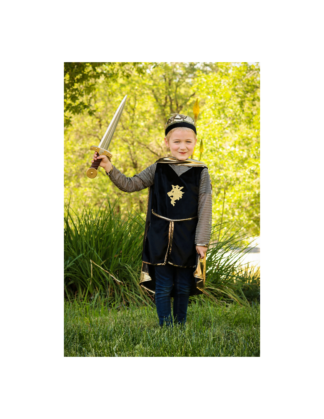 Este conjunto incluye una túnica con capucha, capa de caballero y corona de caballero. Un emblema de león brillante está adornado en el frente de la túnica de terciopelo negro, con tela similar a una cota de malla para la capucha y las mangas largas. La capa, hecha de punto dorado y con velcro para ponerla y quitarla fácilmente, completa el conjunto. Además, no olvides la última pieza, ¡la corona de caballero a juego adornada con detalles!