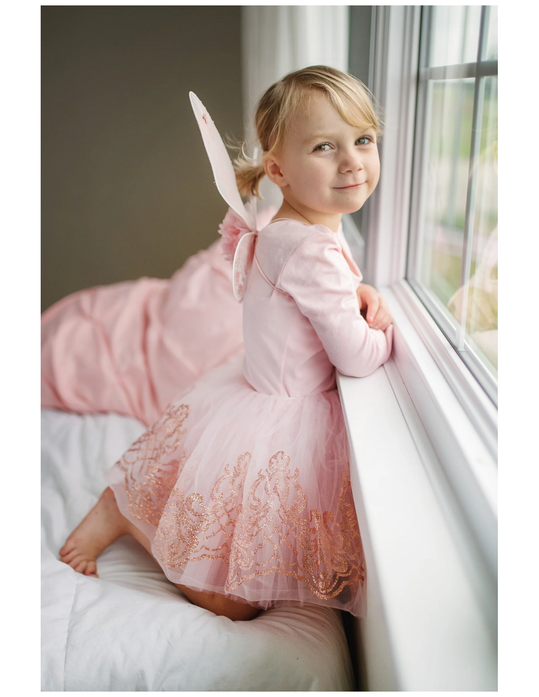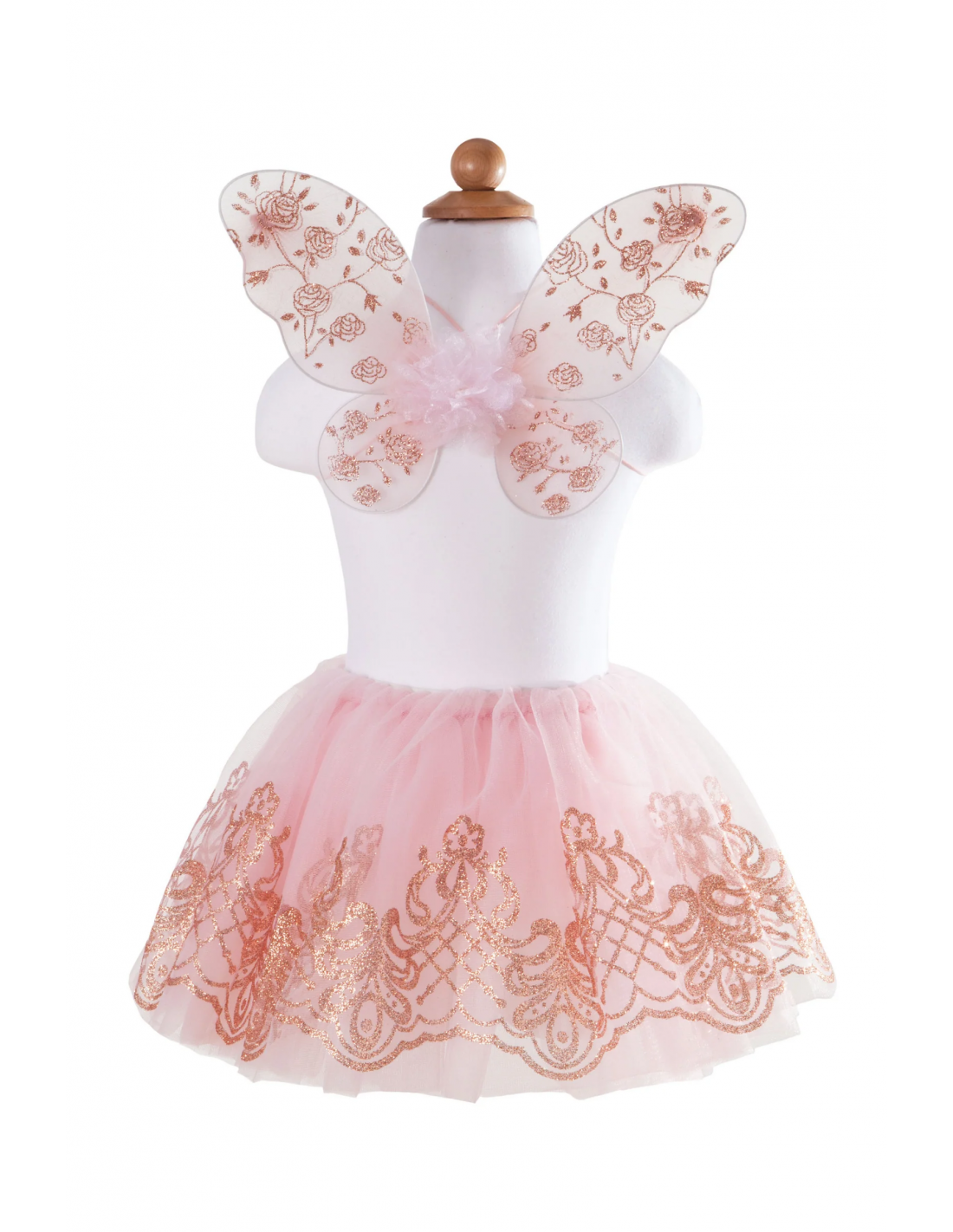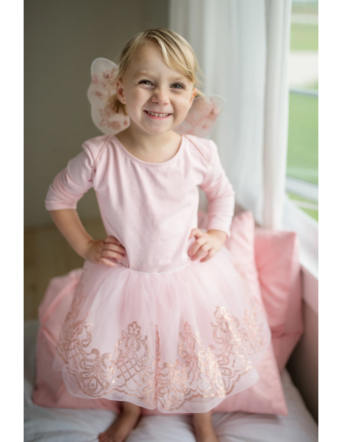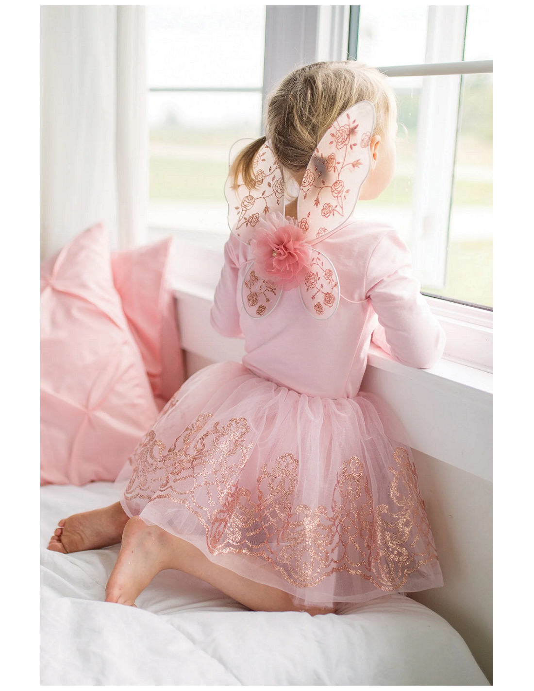 Este conjunto angelical es precioso y a la vez adorable. Su suave falda de tul es perfecta para una princesa, con detalles de purpurina en oro rosa fruncida en una cinturilla elástica para mayor flexibilidad. ¡Este conjunto de dos piezas incluye alas a juego! Una rosa extra-grande se encuentra en el centro de un estampado glamuroso con purpurina a juego con la falda. Deja que brille la princesa oro rosa que llevas dentro.