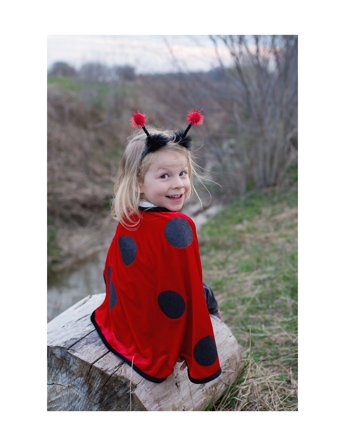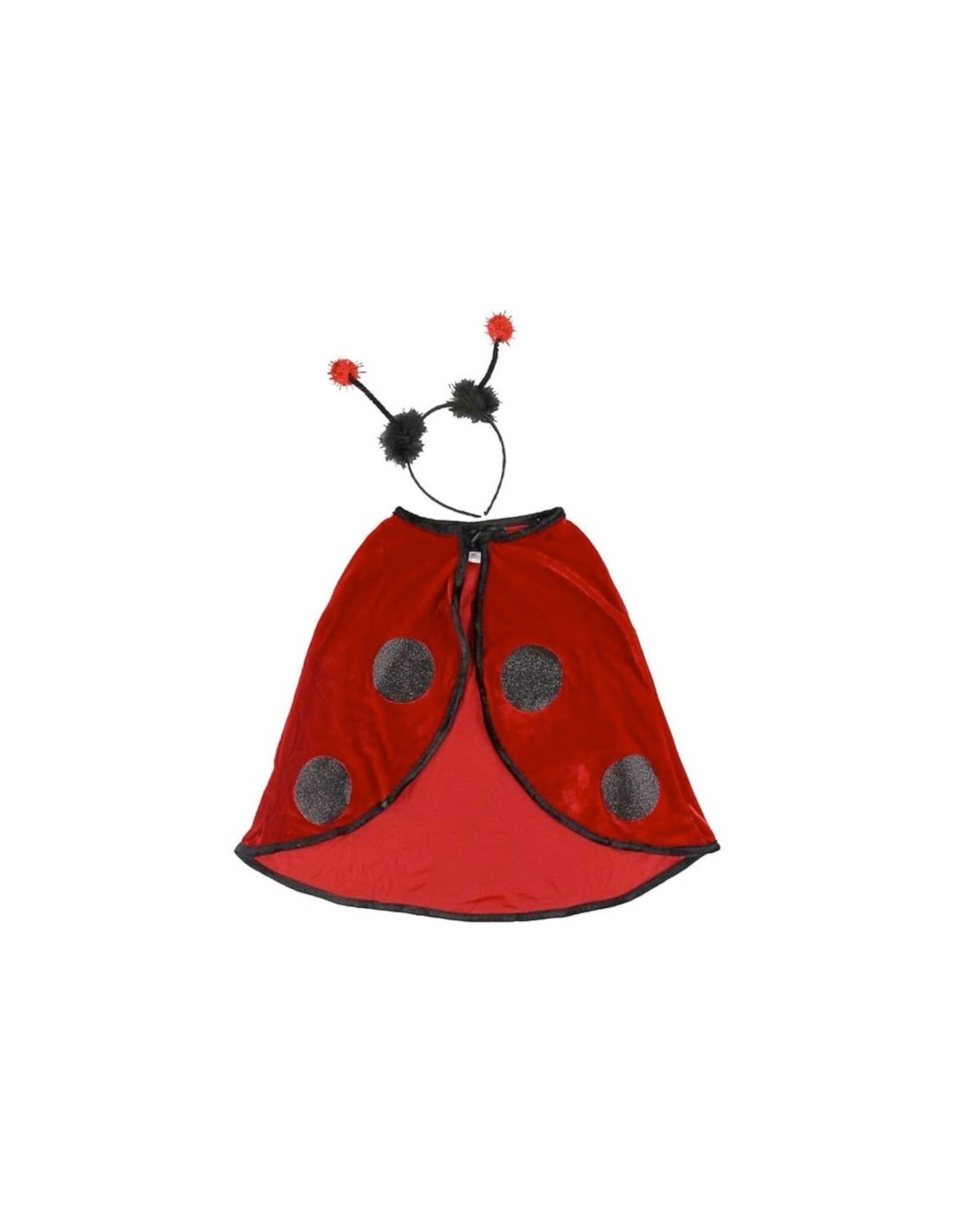Tu peque se convertirá en una adorable mariquita con este conjunto de capa y diadema. La diadema es negra, con plumas negras y antenas rojas con purpurina. La capa, de color rojo, tiene grandes lunares negros con purpurina y se cierra con velcro en el cuello. Además, está confeccionada con un suave tejido de terciopelo.