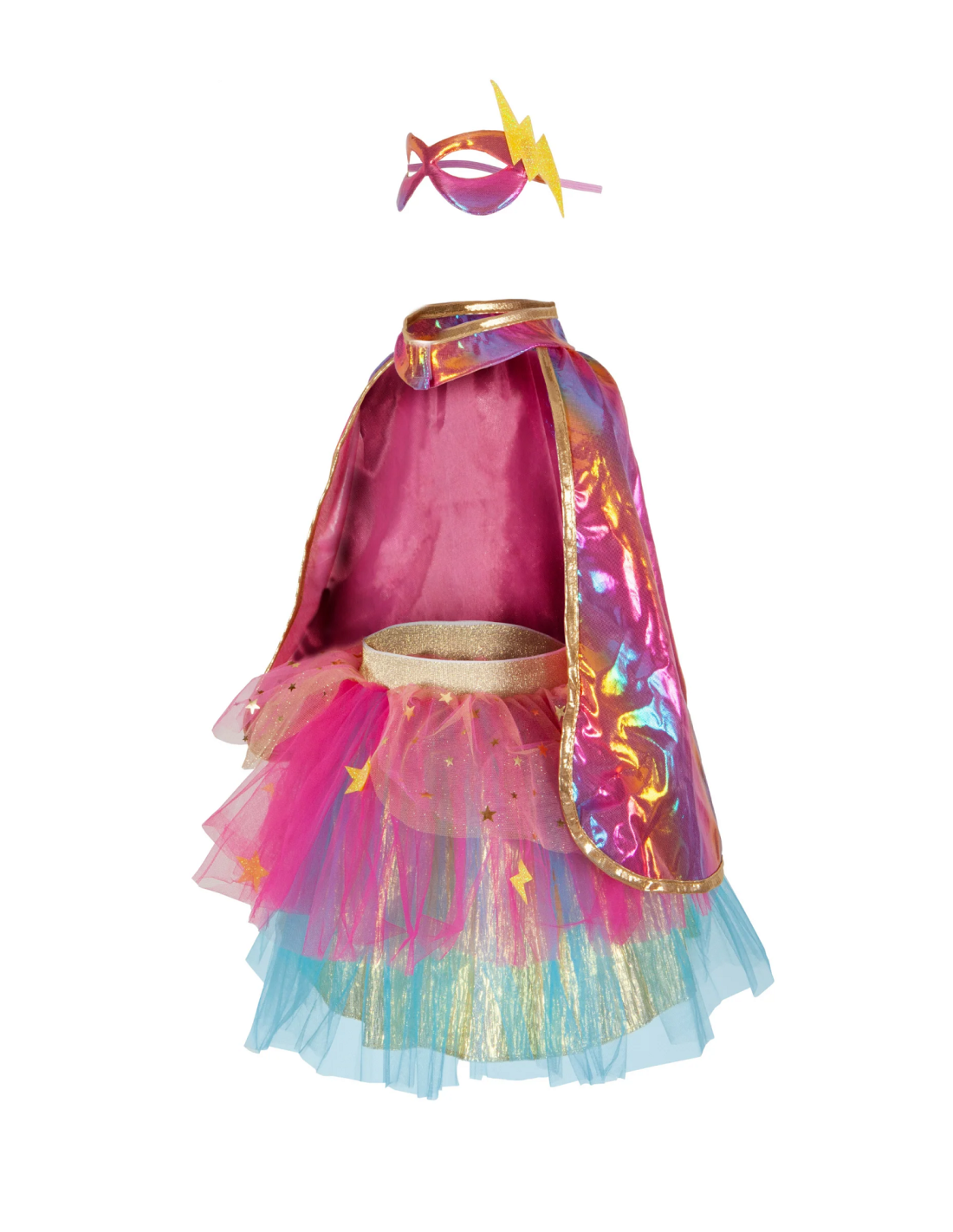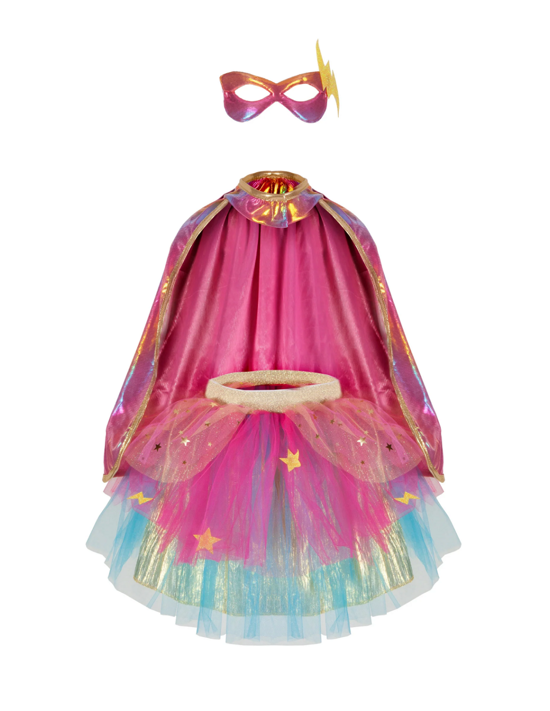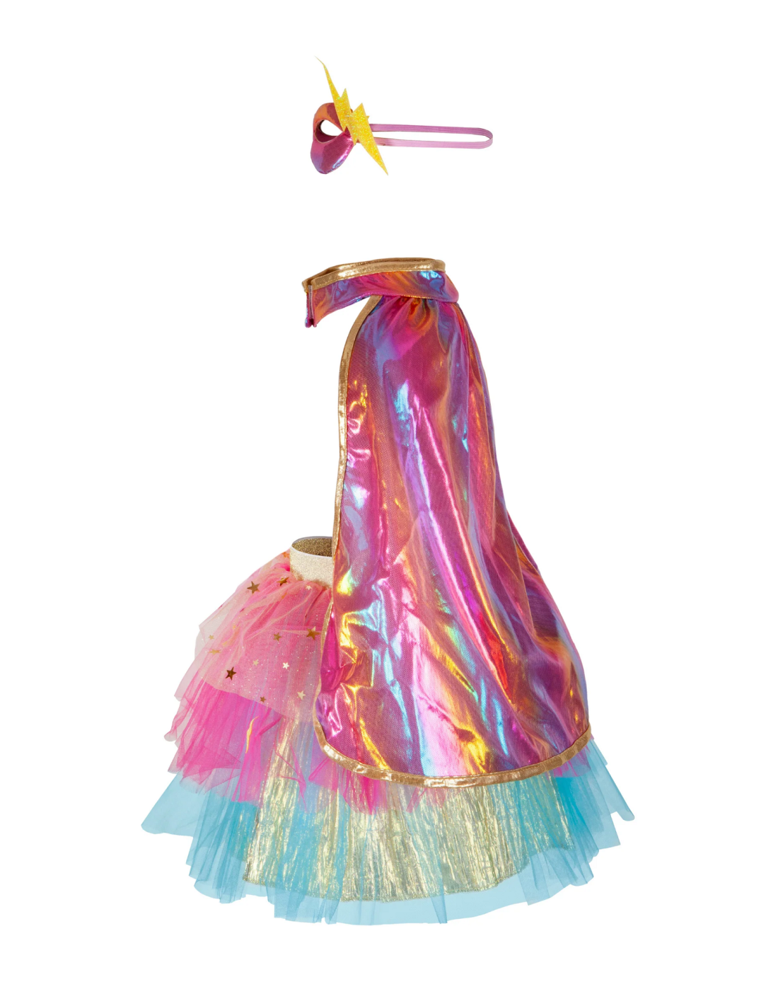 ¡Este conjunto de tutú, capa y máscara es alucinante! ¿Quieres disfrazarte de superheroína o de estrella del rock? La cintura está forrada con tela para un acabado elegante y mayor comodidad (sin riesgo de rozaduras). Los bordes de los emblemas en la parte posterior de la capa están bordados para un acabado impecable. La capa, de color rosa holográfico, tiene una gran estrella brillante en la parte posterior y está forrada para un acabado elegante. La falda tiene un vuelo acampanado y dos capas de tul, con una capa inferior metálica brillante; además, incluye detalles de estrellas y rayos, con un pequeño círculo de fieltro en la parte posterior para fijarlos al tul. La máscara es de doble cara y tiene un diseño de rayo, a juego con el resto del conjunto.