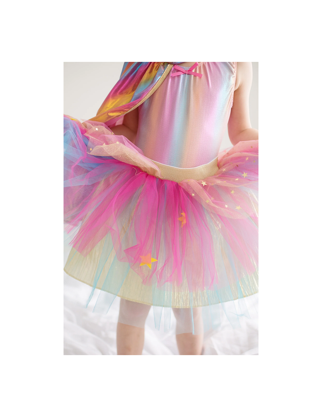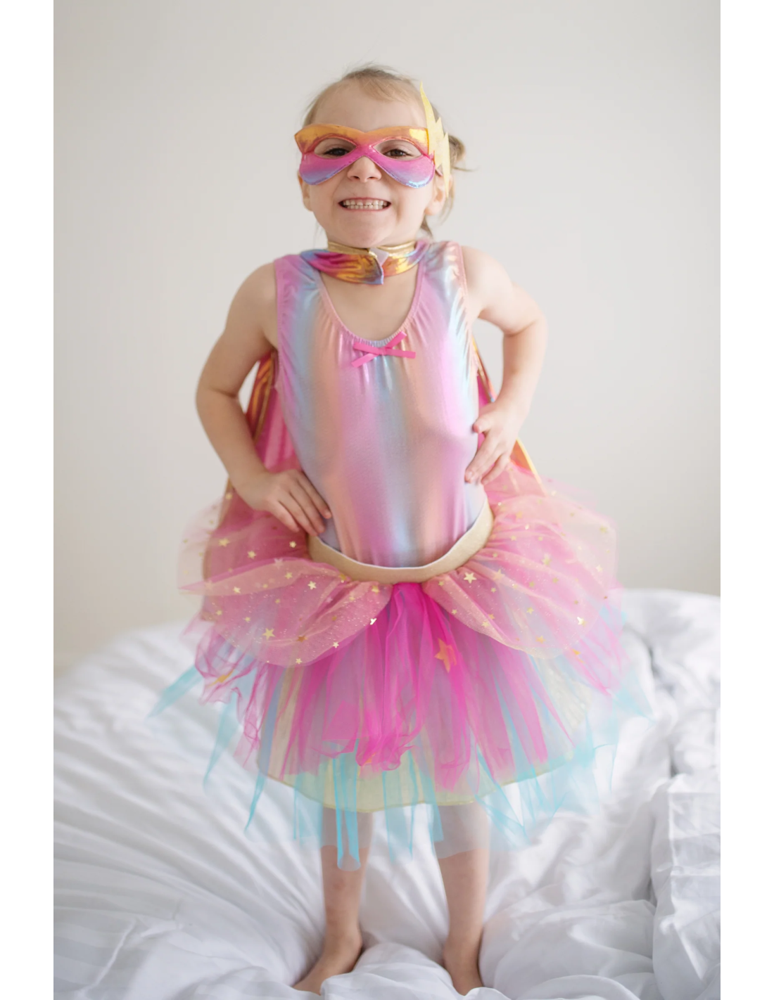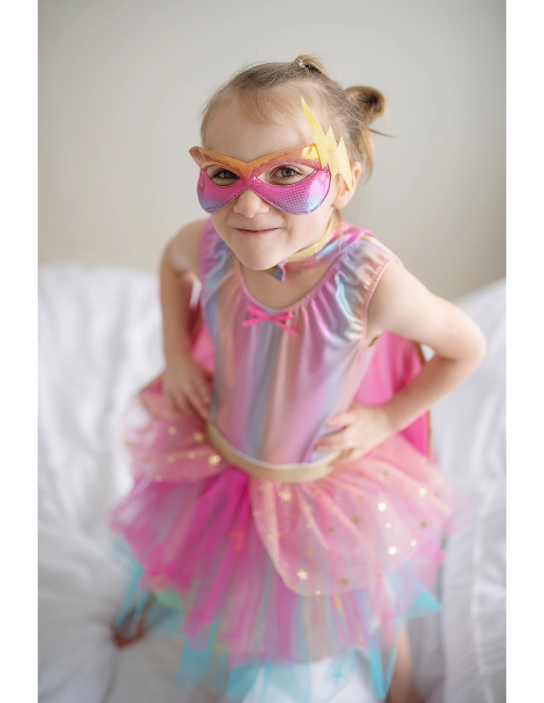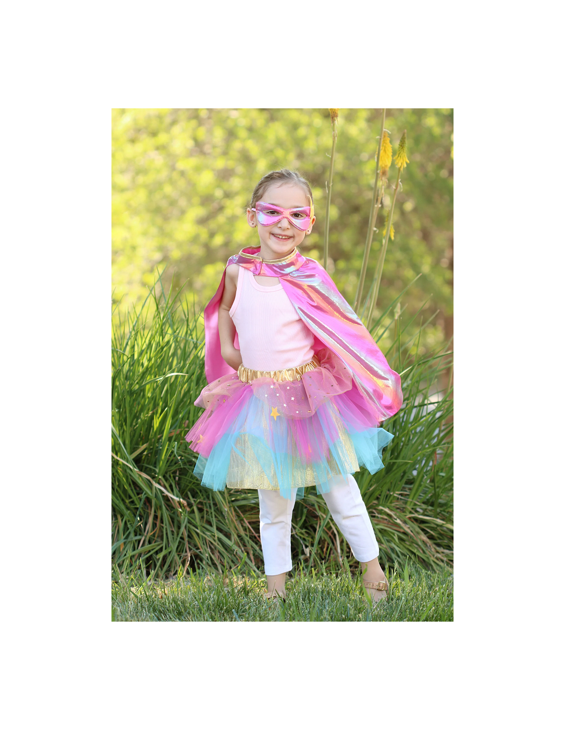 ¡Este conjunto de tutú, capa y máscara es alucinante! ¿Quieres disfrazarte de superheroína o de estrella del rock? La cintura está forrada con tela para un acabado elegante y mayor comodidad (sin riesgo de rozaduras). Los bordes de los emblemas en la parte posterior de la capa están bordados para un acabado impecable. La capa, de color rosa holográfico, tiene una gran estrella brillante en la parte posterior y está forrada para un acabado elegante. La falda tiene un vuelo acampanado y dos capas de tul, con una capa inferior metálica brillante; además, incluye detalles de estrellas y rayos, con un pequeño círculo de fieltro en la parte posterior para fijarlos al tul. La máscara es de doble cara y tiene un diseño de rayo, a juego con el resto del conjunto.