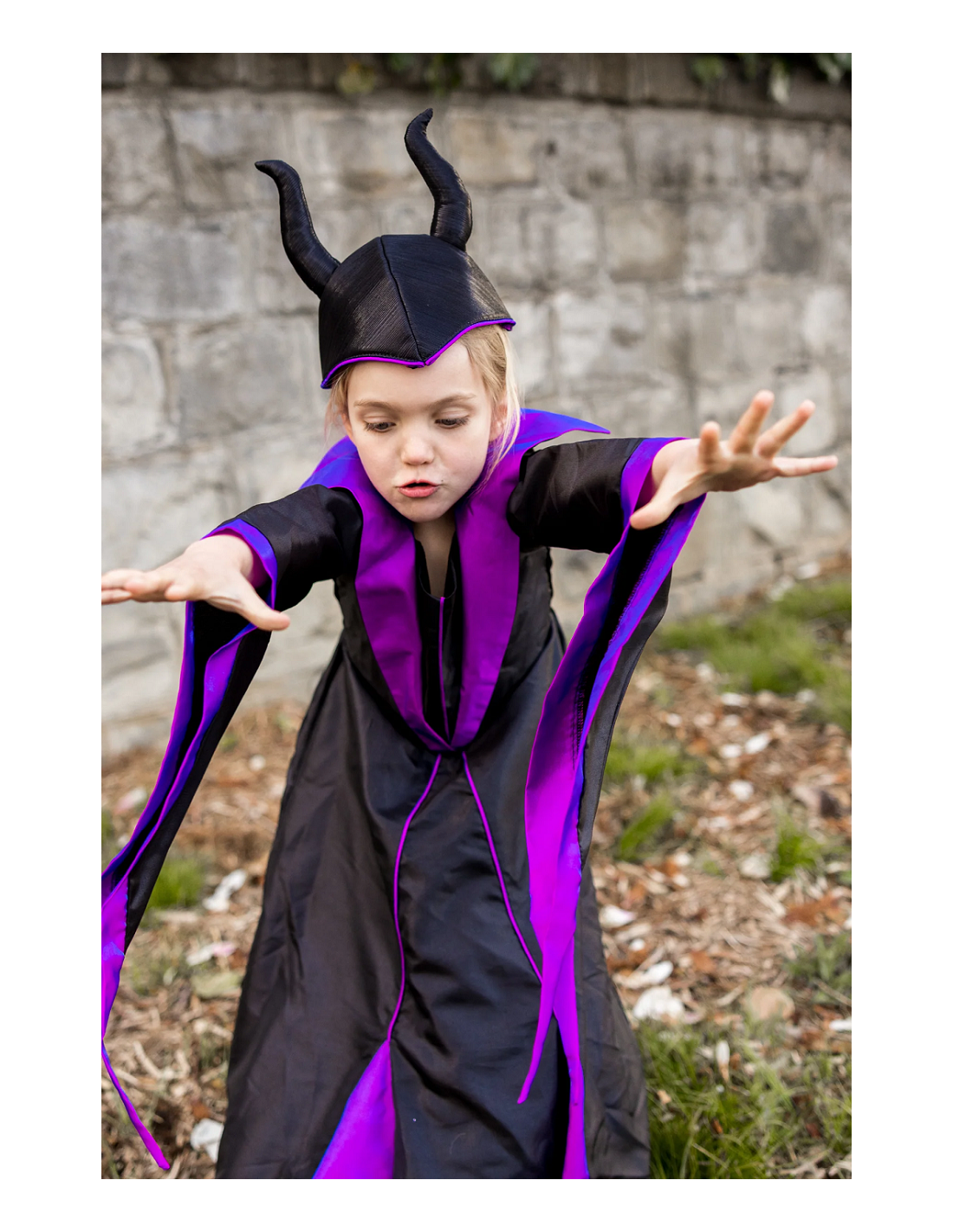 ¡Presentamos este encantador vestido de princesa villana! Abraza el lado oscuro con este cautivador vestido. El vestido presenta una magnífica silueta que llama la atención. Su diseño largo te envuelve con gracia, irradiando un aire de misterio y poder. Confeccionado en ricos tonos negros y morados, y mangas largas acampanadas, este vestido les transformará en la personificación de la realeza villana. Incluye tocado.