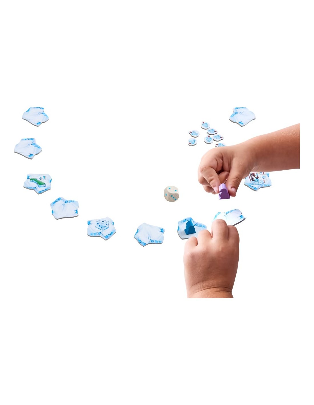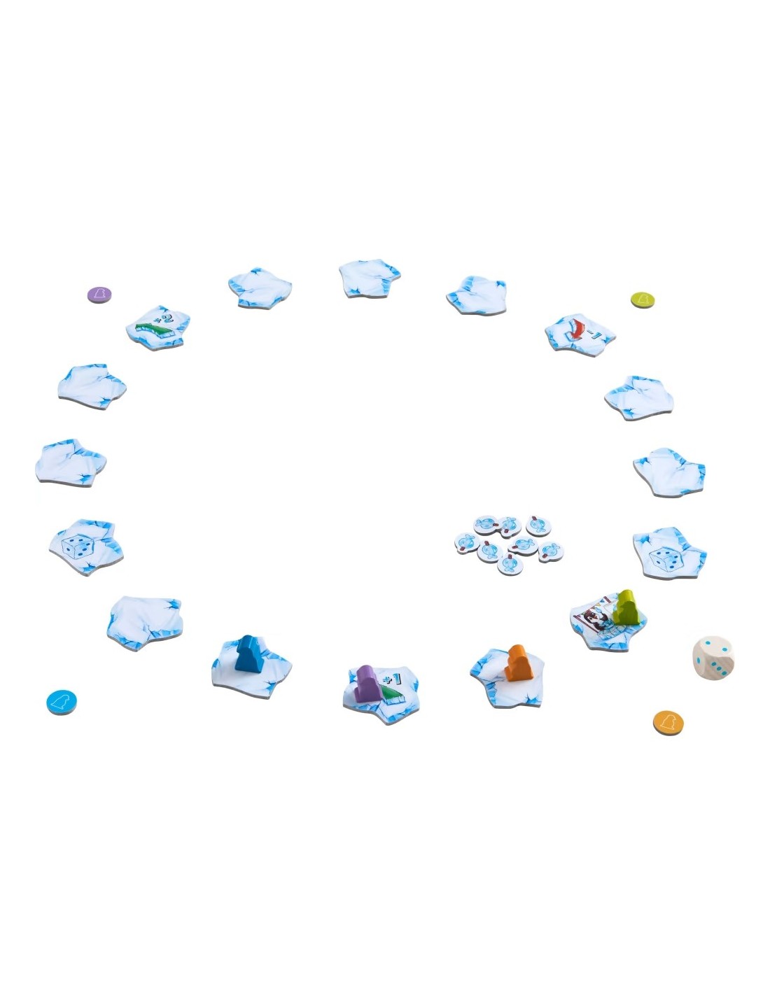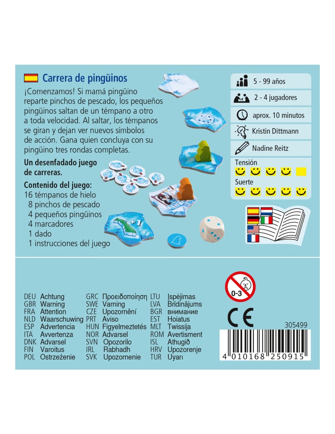 Si mamá pingüino reparte pinchos de pescado, los pequeños pingüinos saltan de un témpano a otro a toda velocidad. Al saltar, los témpanos se giran y dejan ver nuevos símbolos de acción. Gana el primer jugador que termine tres rondas con su pingüino.
