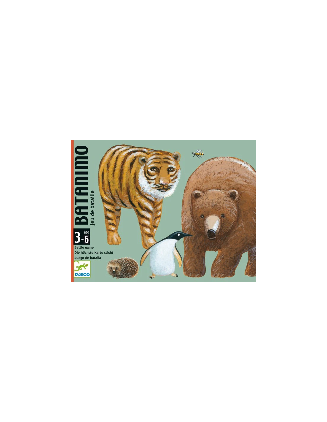 Un adorable juego de batalla para los más pequeños, con preciosas ilustraciones de animales variados. 1, 2, 3: los jugadores dan la vuelta a la vez a la primera carta de su mano. ¡Si hay varios animales del mismo tamaño, ¡hay «Batanimo»! Cuando un jugador ha ganado todas las cartas, gana la partida.