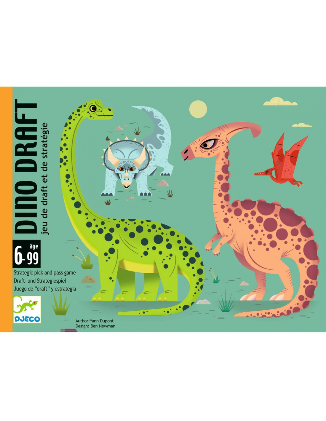 Los estegosaurios, triceratops, braquiosaurios y pterodáctilos han salido de paseo. En este juego, las cartas van pasando de mano en mano, pero solo puedes conservar una cada vez. Un juego de estrategia tipo draft que encantará a amantes de los dinosaurios.
