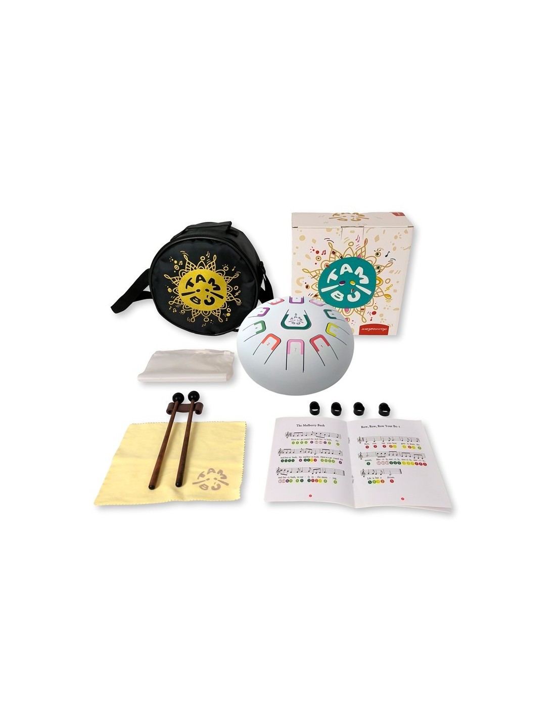 El tambor metálico de lengüetas es un bonito instrumento musical para iniciarse en el fascinante mundo de la percusión. Tiene un sonido aterciopelado y puede hacerse sonar de diferentes maneras. Viene acompañado de partituras en números y colores para aquellos que empiezan. Incluye una práctica bolsa para guardarlo y transportarlo.