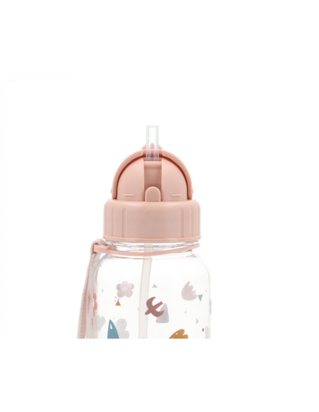 Esta botella tiene una pajita de silicona abatible que sale automáticamente cuando se abre la tapa. Es ideal para llevar al cole. Tiene un asa larga que permite llevarla colgada en la mochila o en el carrito del bebé.