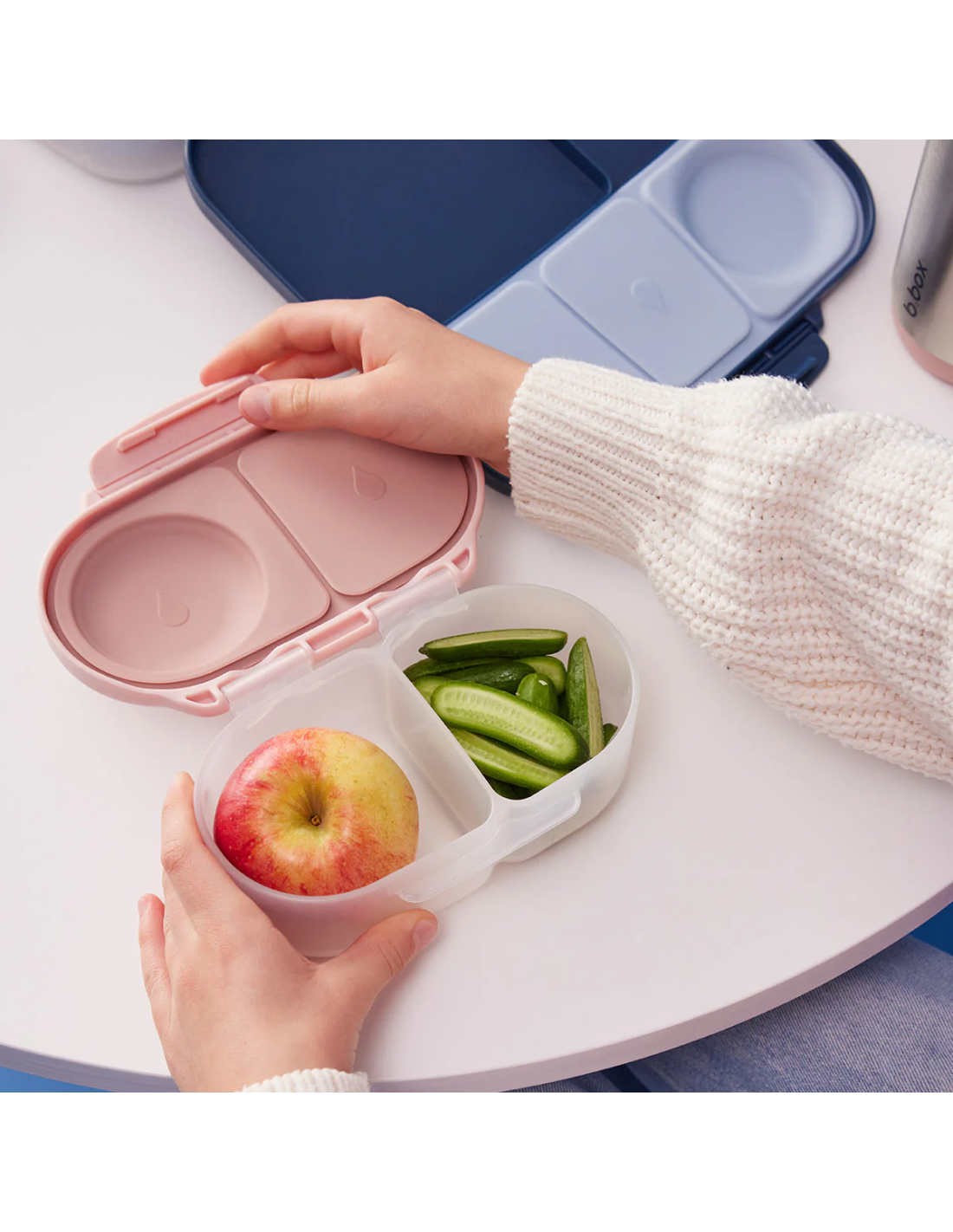 Con esta cajita snack la hora de la merienda es mucho más fácil. La opción perfecta para raciones más pequeñas: para el colegio, el parque, una excursión, una tarde de compras, etc. El compartimento de tapa flexible permite transportar la fruta entera. Los dos compartimentos cuentan con la protección a prueba de fugas de la almohadilla de silicona, por lo que se pueden transportar snacks semilíquidos, como puré, yogures, raciones de comida con salsa El clip de fácil apertura y cierre es suficientemente grande para las manos de los más pequeños, y la almohadilla flexible es extraíble para una limpieza fácil e higiénica.