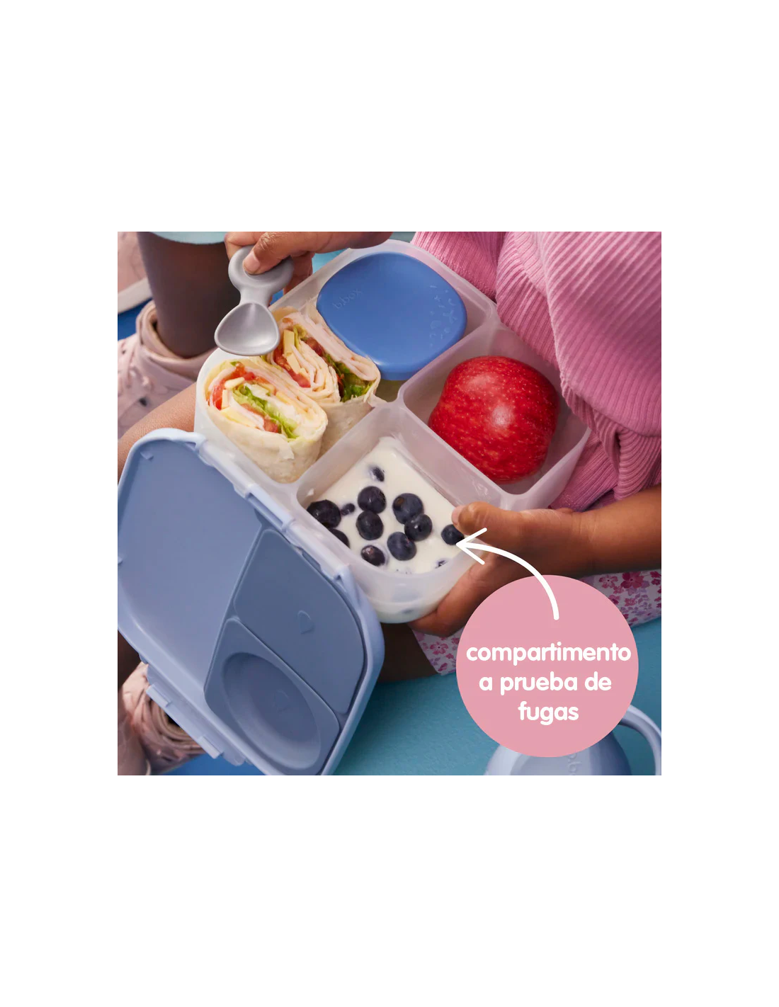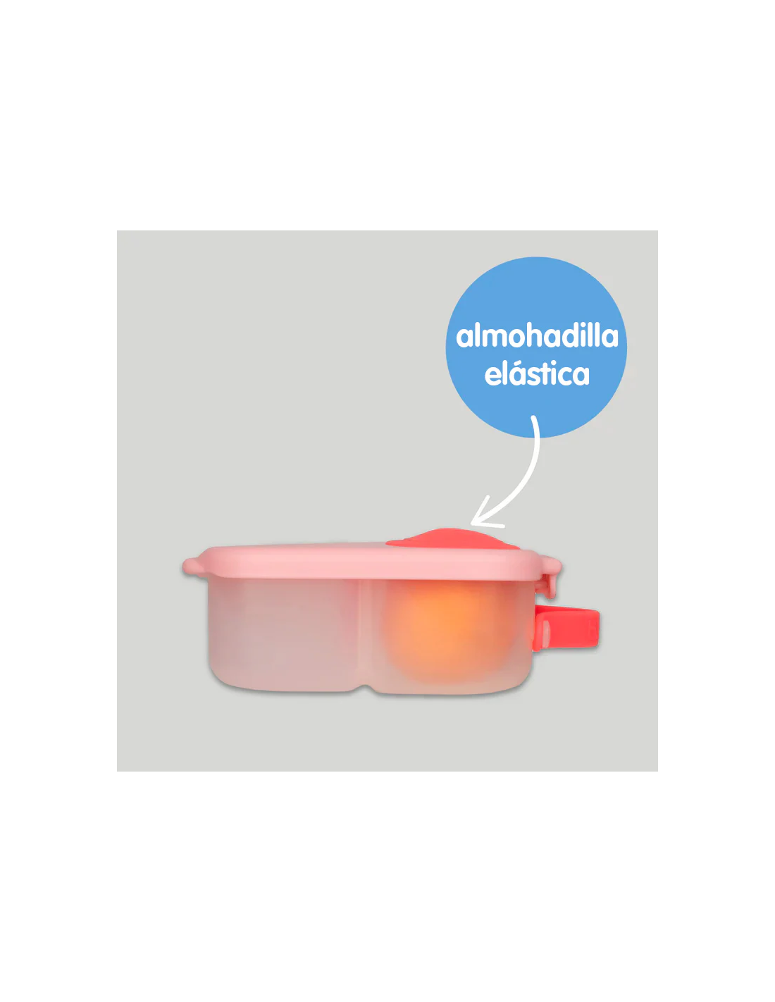 Esta fiambrera es compacta, pero tiene mucho espacio para ofrecer almuerzos saludables y variados: cuenta con un compartimento con almohadilla elástica para frutas enteras y dos compartimentos a prueba de fugas con una almohadilla de silicona flexible, aptos para alimentos semilíquidos, como puré, yogur, salsas El divisor extraíble se desliza fácilmente, lo que permite ajustar el tamaño del compartimento. Cuenta con asa de transporte suave y de fácil agarre, y clip grande adecuado para los dedos pequeños, que permite una fácil apertura fomentando la independencia de los niños. La almohadilla es extraíble para su limpieza.
