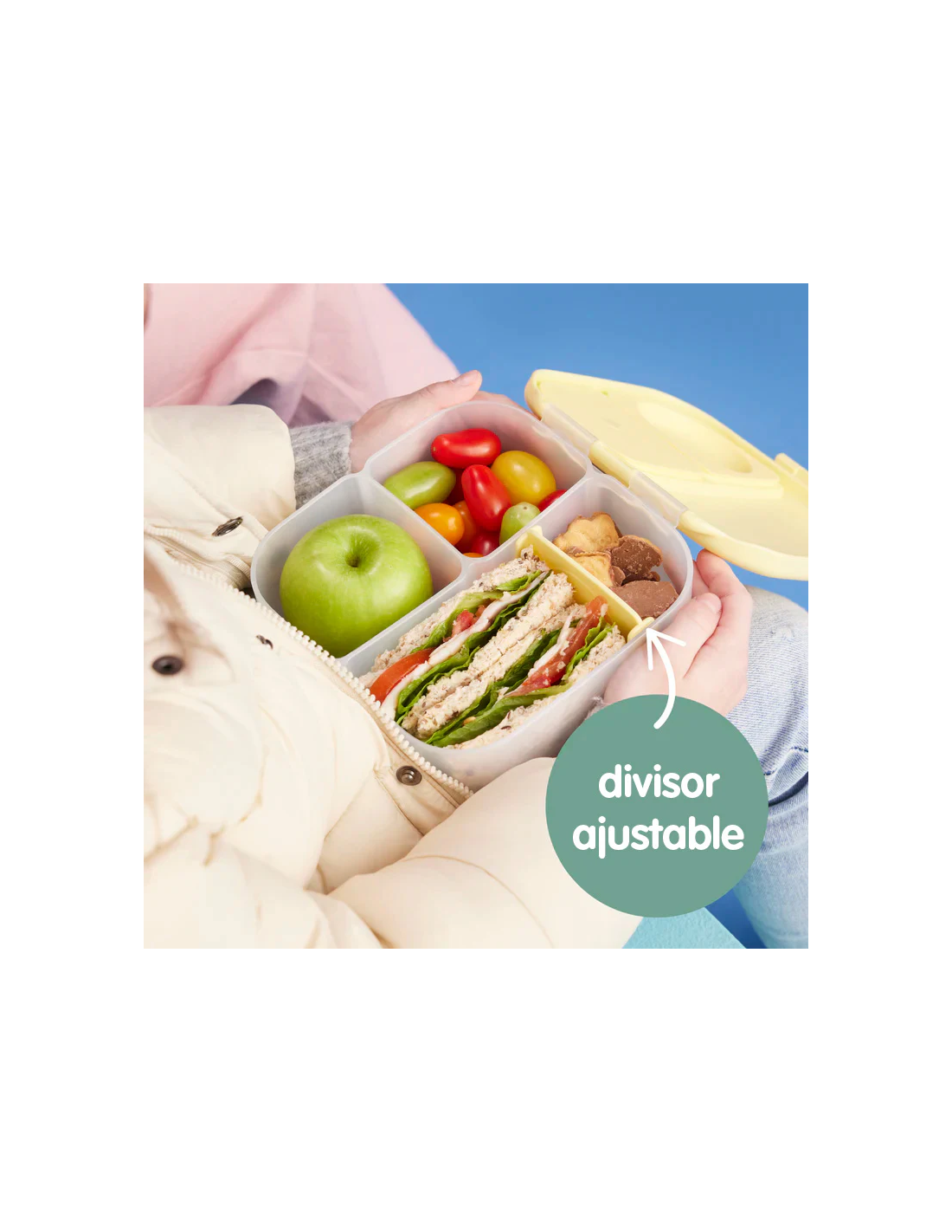 Esta fiambrera es compacta, pero tiene mucho espacio para ofrecer almuerzos saludables y variados: cuenta con un compartimento con almohadilla elástica para frutas enteras y dos compartimentos a prueba de fugas con una almohadilla de silicona flexible, aptos para alimentos semilíquidos, como puré, yogur, salsas El divisor extraíble se desliza fácilmente, lo que permite ajustar el tamaño del compartimento. Cuenta con asa de transporte suave y de fácil agarre, y clip grande adecuado para los dedos pequeños, que permite una fácil apertura fomentando la independencia de los niños. La almohadilla es extraíble para su limpieza.