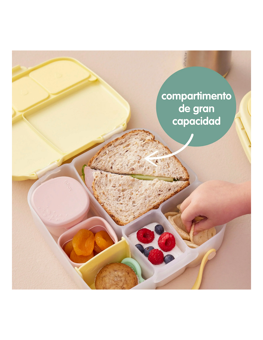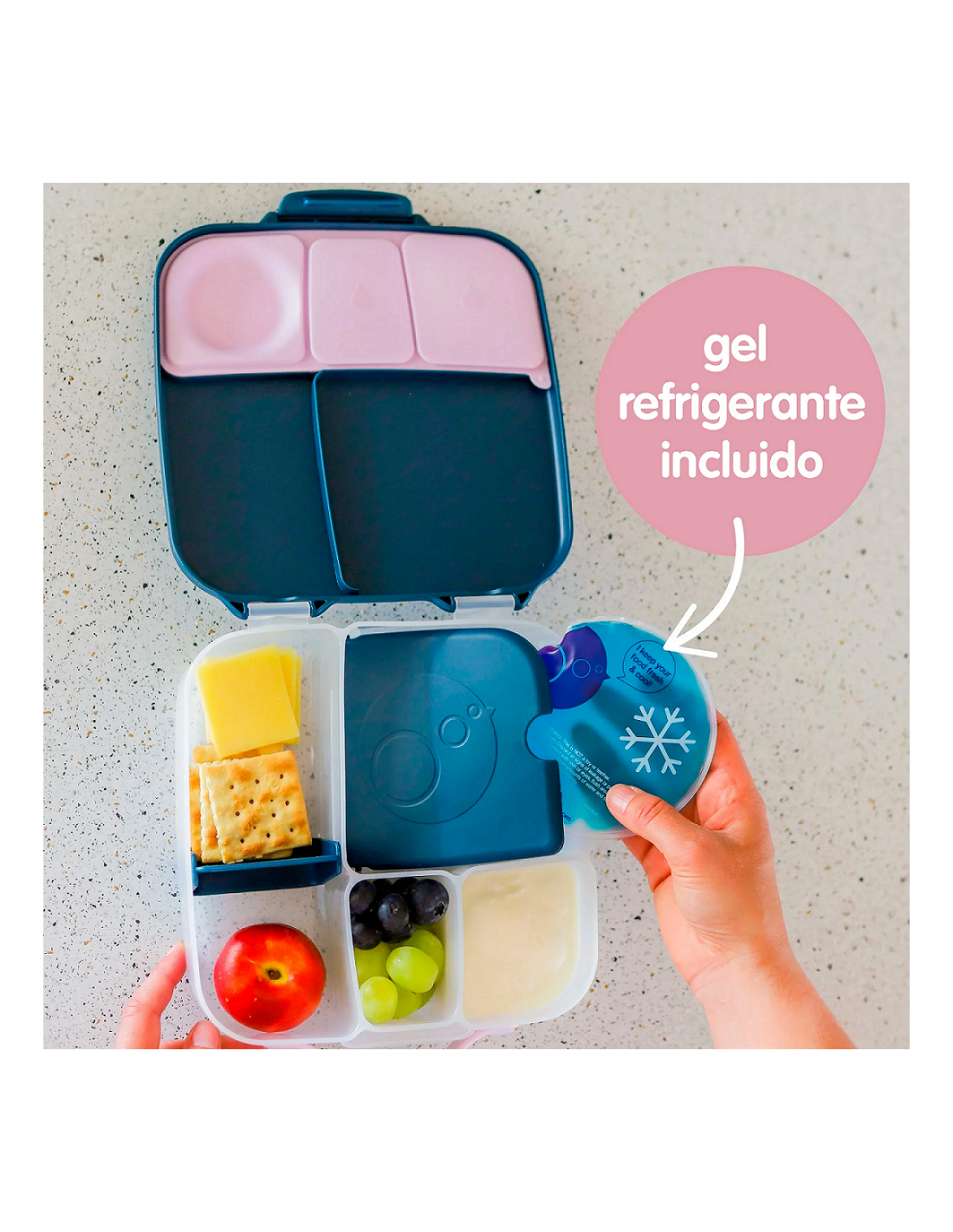 Esta fiambrera cuenta con un compartimento grande en el que cabe un sándwich entero, y bajo la bandeja, hay un gel refrigerante para mantener los alimentos frescos durante más tiempo. Retirando esta bandeja, se puede usar el compartimento para añadir una porción más grande de comida. Podrás guardar fruta entera gracias a su exclusivo compartimento flexible. La almohadilla de silicona a prueba de fugas permite almacenar alimentos semilíquidos como sandía, yogures… El divisor se desliza para ajustar el tamaño de los compartimentos, o se puede quitar para que quepa un plátano o un wrap. La almohadilla es extraíble para una limpieza profunda.