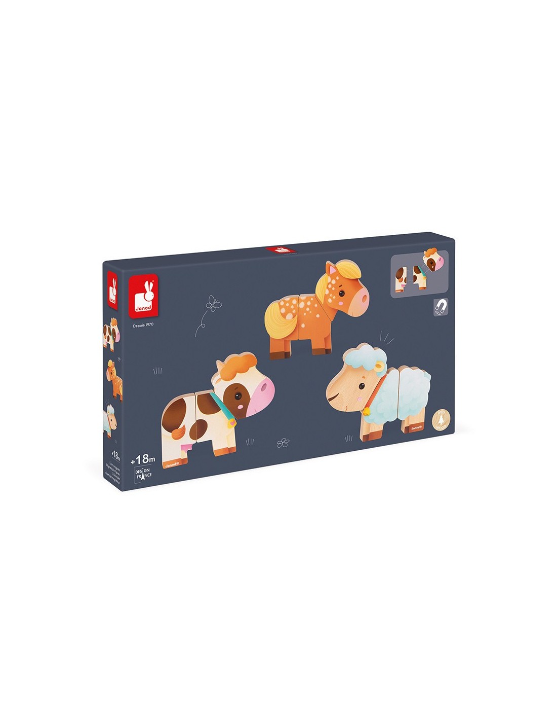 Tres animales en tres piezas magnéticas para descomponer, mezclar y recomponer sin fin. Un divertido juego de asociación e imaginación perfecto para desarrollar la motricidad y la creatividad de los pequeños.